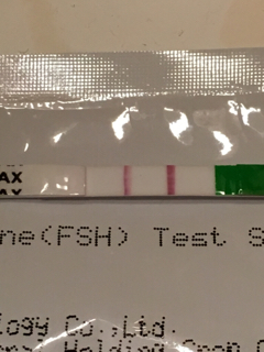 Ai niin meinasin unohtaa. Tein menopaussitestin päivällä, mutta siinä ei ollut muita ohjeita kuin mitä oli pussin taakse painettu. Onko tämä nyt tulkittava niin, että jos näkyy edes tuollainen ihan haalea viiva niin se on positiivinen? Eli nytkö ne vaihdevuodet iskivät?