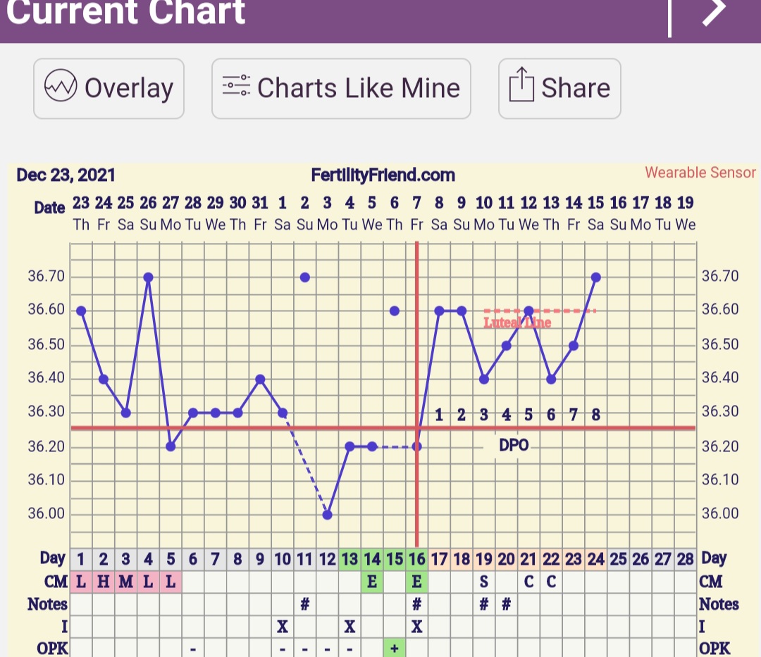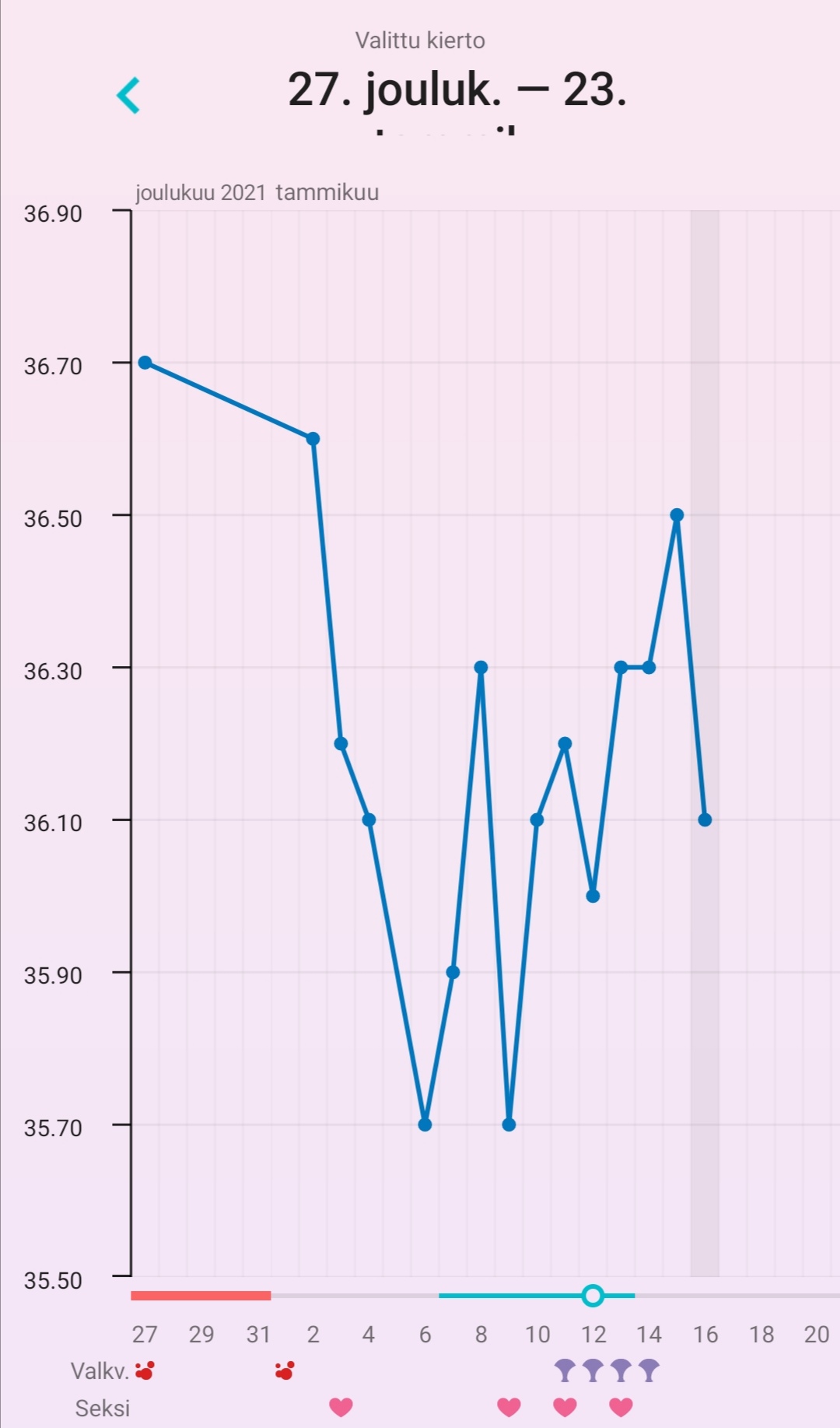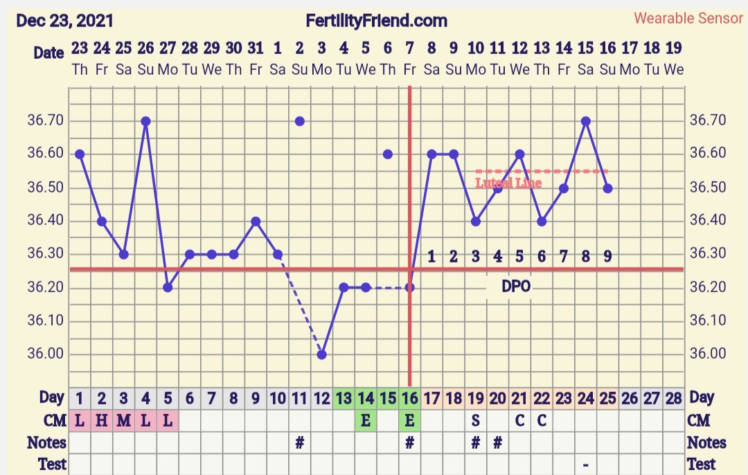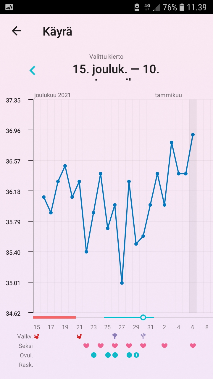Noniin, nyt lämmöistä päätellenkin ovulaatio viimein eilen tapahtui! Nyt siis kp 17 , dpo 1 ja lämmöt lähti nousuun. Tuo yks harhapiikki jonka oon discardannu oli päivä rokotteen jälkeen joka teki vähä kummallisia olotiloja ja nosti lämpöä. Toivotaan parasta vaikka tallettelut saatiin vaan eilen muutama tunti jo tapahtuneen oviksen jälkeen ja dpo -3...