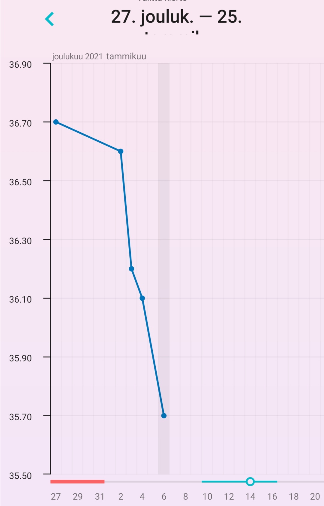 Mä luulen että mun mittailut ei kyllä tässä kierrossa ole kovin luotettavia. Ihmeen alhaisia lämpötiloja antaa koko ajan. Lapsella jo testasin että mittari toimii..