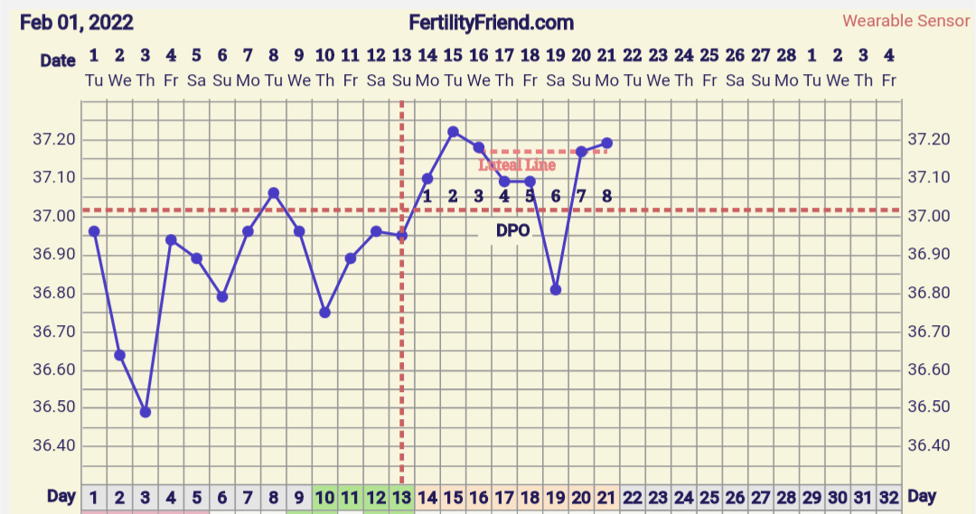 Mulla näyttää käppyrä tältä ja uskon, et nyt on dpo 9 tai 10, eikä 8 niinkuin tuossa on. Vähän jännittää, mut en kyl usko kovin tosissani tärppiin. Testailen to tai pe, jos sitä ennen ei kuulu menkkoja..