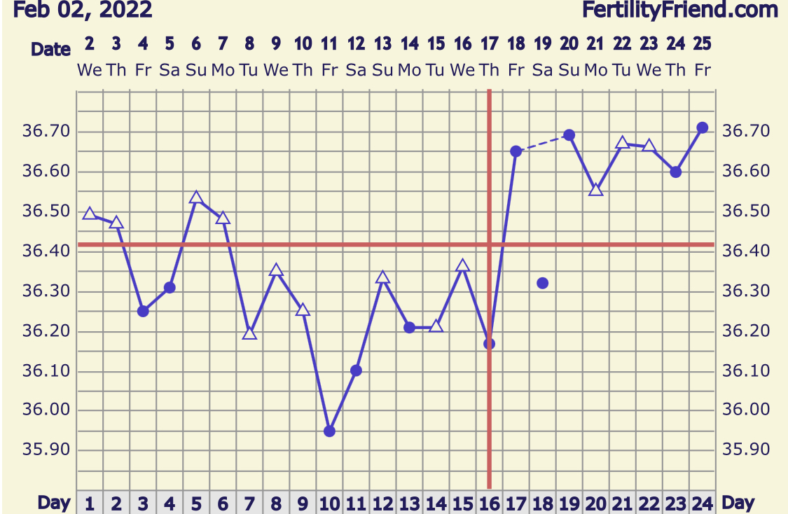Tässä lämmöt. Tuon yhden oviksen jälkeisen lämmön discardasin, koska olin silloin muualla kuin kotona yön ja olin nenänpäätä myöden jäässä, eli uskon että matala lämpö johtui viileästä huoneilmasta. :smiling-eyes: