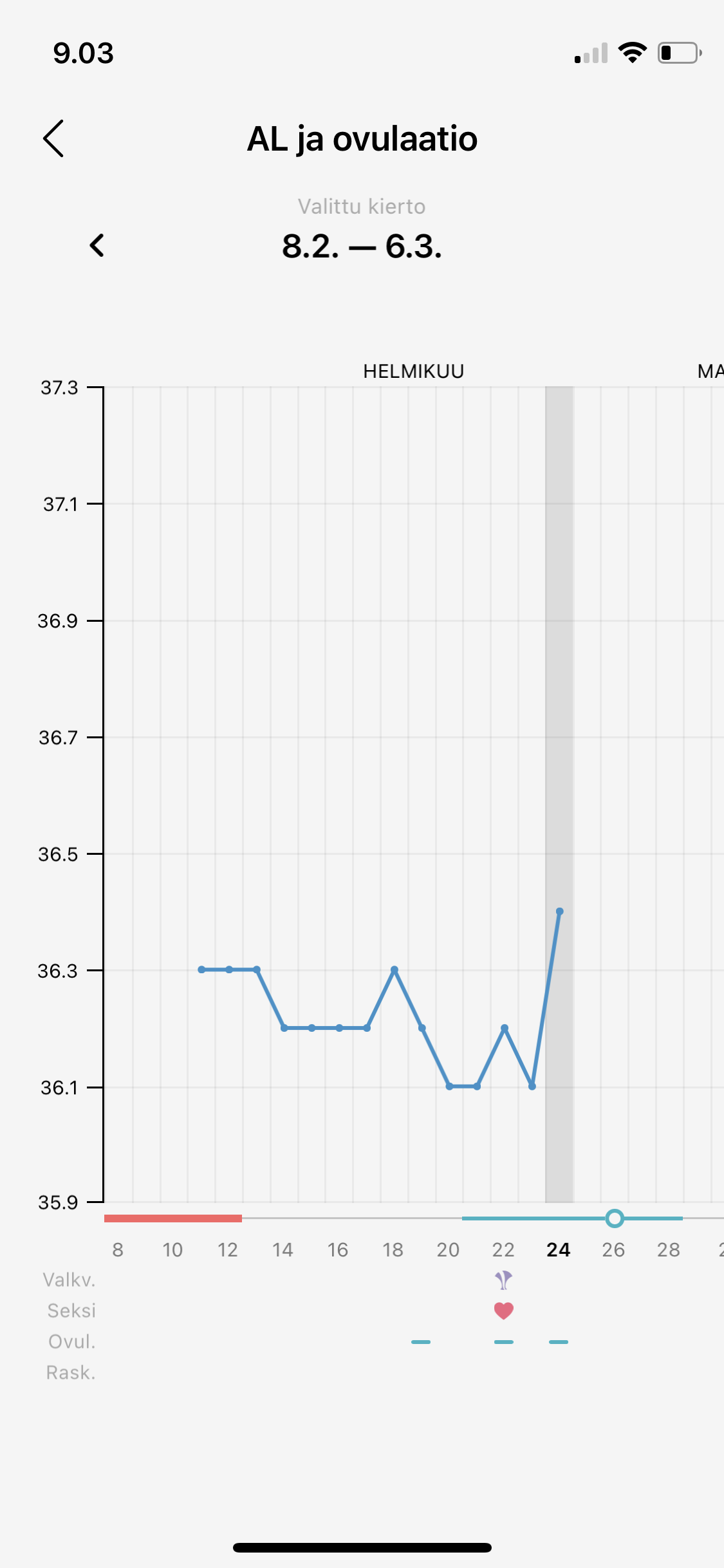 Moikka vaan tännekin ketjuun! Esikoista yrittäessä seurailin lämpöjä, lähinnä vaan mielenkiinnosta ovulaation varmentamiseksi, kun oli myös ovistestit käytössä. Nyt olis sama homma, tosin en tiedä onko lämpöjen seuraili mitenkään tarkkaa, kun aamuyöt on vähän repaleisia… Olen nyt ekaa kertaa mittaillut lämpöjä raskauden jälkeen, ja mietin että olikohan mulla jo eilen ovis vai onko vasta tulossa :Grimacing Face:.