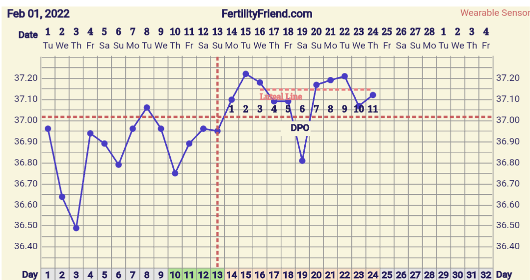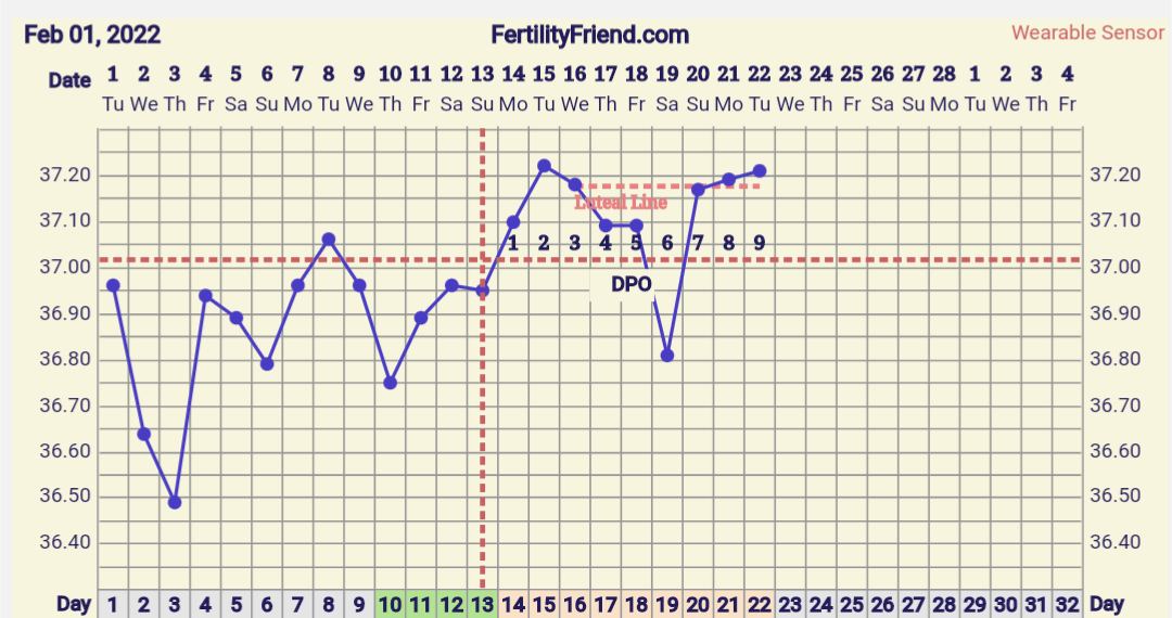 Täällä ei vielä menkkoja ja käyrä tasaisen tylsä. Eli ehkä dpo 8 vasta, yhtään vähemmän se ei kai ainakaan voi olla??