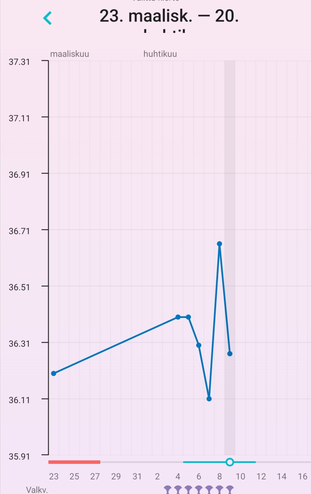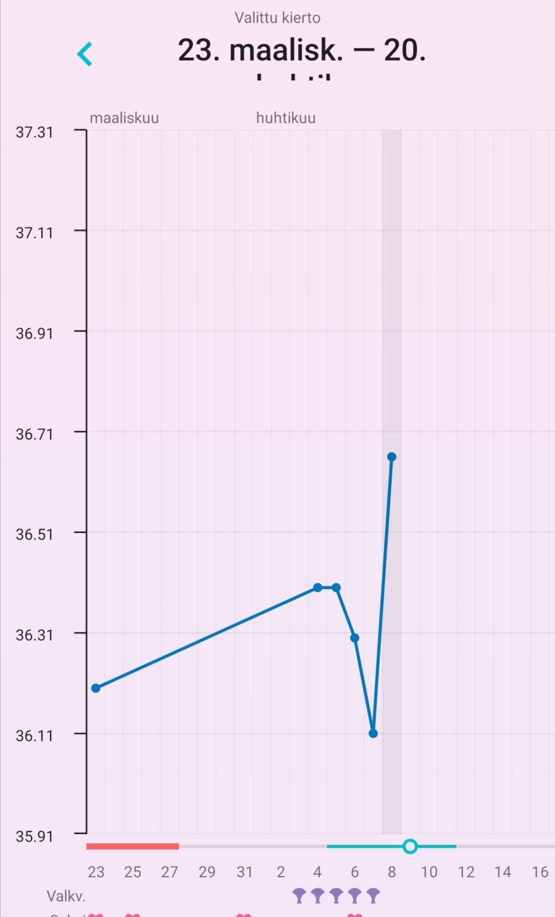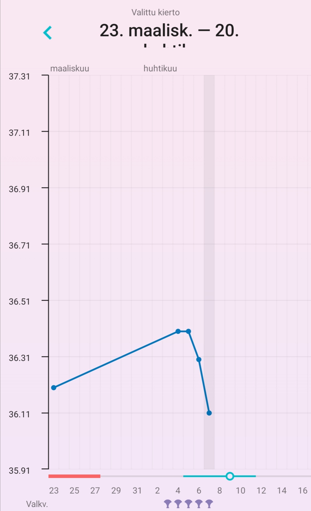 Mä nyt sittenkin vähän mittaillut lämpöjä, kerran kotona oleilu osunut sopivasti oviksen tienoille. Tänään kp 16 ja lämmöt tippunut alhaiseksi, voisi olla siis tänään/huomenna ovis. Ärsyttää vaan kun on nyt tänään eri mittari, kun en löytänyt sitä mitä yleensä käytän, niin en voi varma olla mittaako samalla tavalla + koko perhe koronassa ja tietysti miehessä se oireilee perinteisenä miesflunssana.