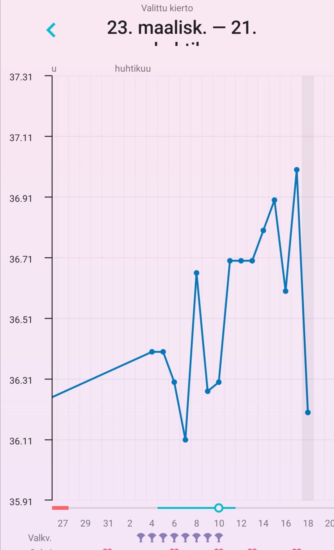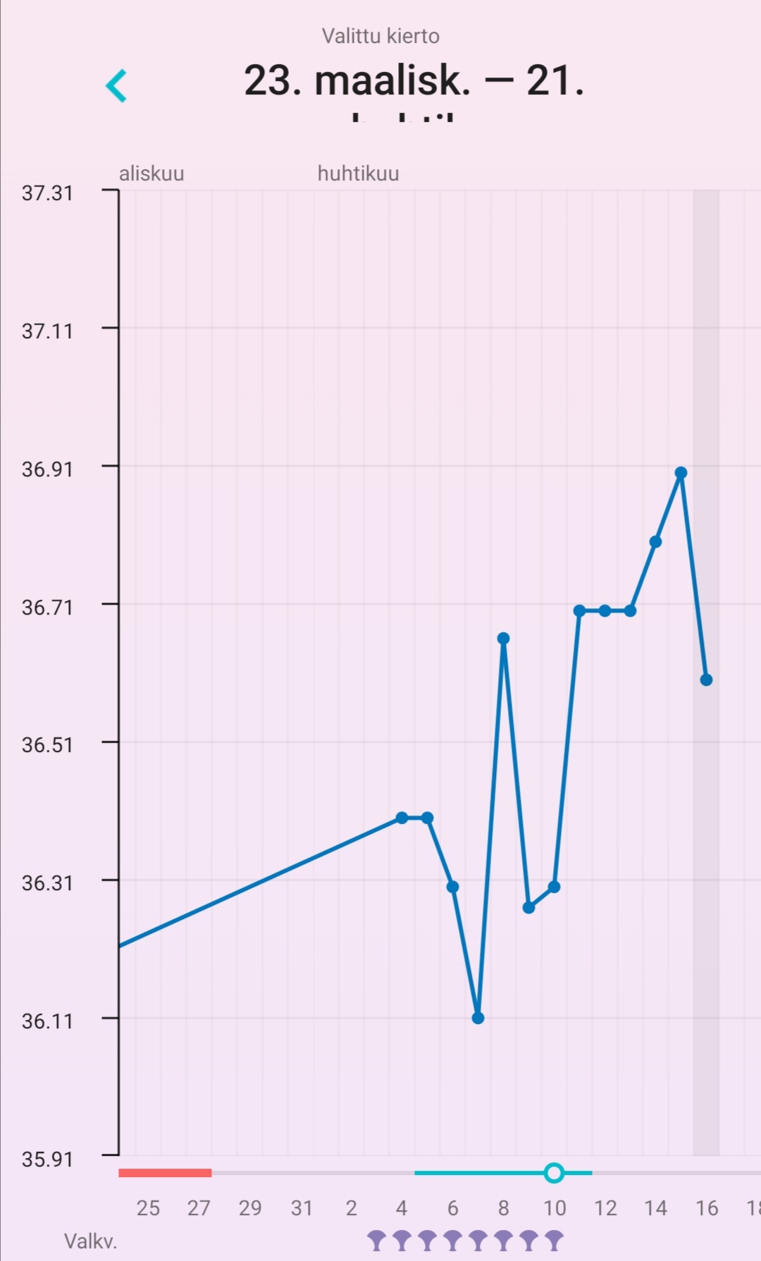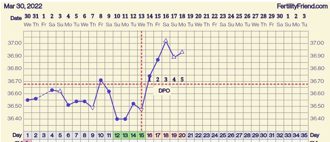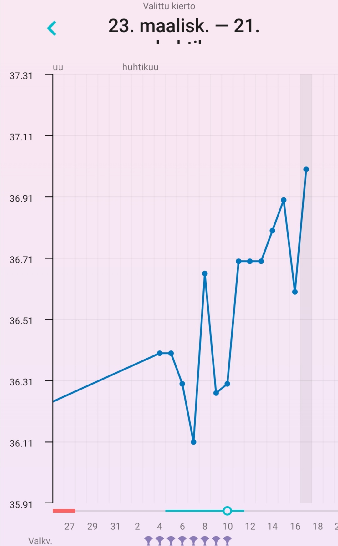 eka ja toka näytti ehkä 36,34 ja 36,41'C jos se ei ollut unta, ja sitten kolmas kerta heti perään 36,24'C. Jos merkkaan ekan tai tokan lämmön ja poistan alkukierron korkeat lämmöt kokonaan, FF merkkaa katkoviivoin oviksen kp13:sta jolloin oli se dippi. Jos taas laitan tuon alemman lukeman, ei FF merkkaa ovista laisinkaan vielä. Taidan tän päivän jättää lämmöistä kokonaan pois kun meni mittailu pelleilyksi.Mun mielestä on yleensä riittänyt 3 peräkkäistä korkeampaa lämpötilaa. Ja jos tikuttanut niin viimeisin ovis plus jälkeinen päivä ovulaatio (joskus näyttänyt 3 päivää plussaa ovis tikku).Tässä mun päivitys, eiköhän se nyt siis ole dpo3eilen tosiaan join pari lasia punkkua illalla ja valvoin kolmeen asti, joten ei kaikista luotettavin tulos tähän päivään
