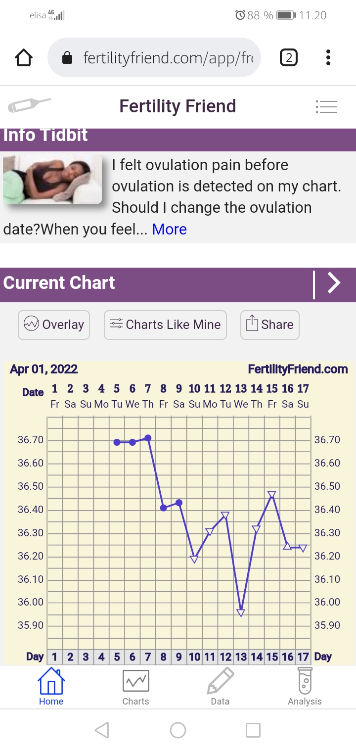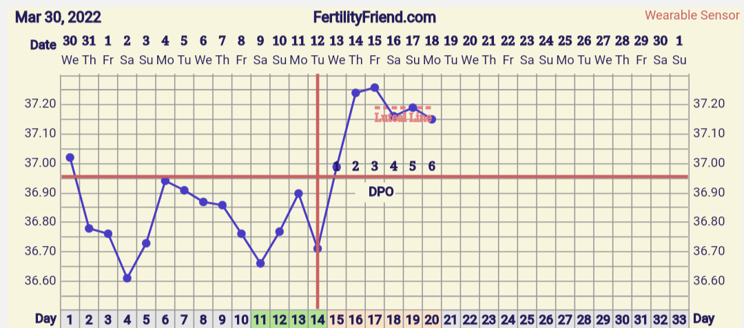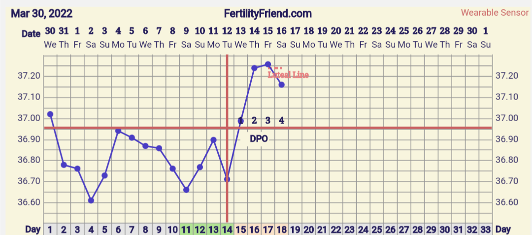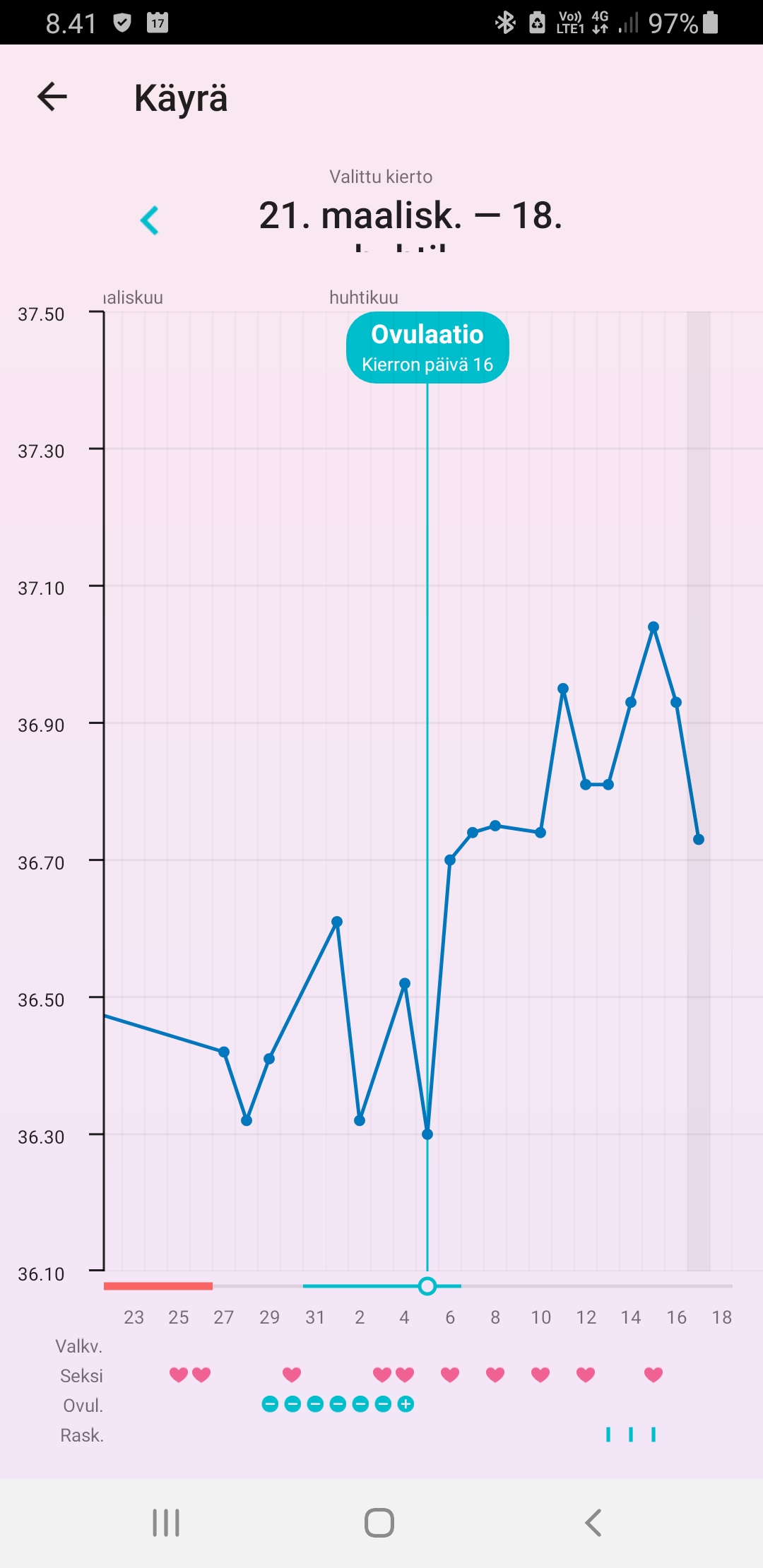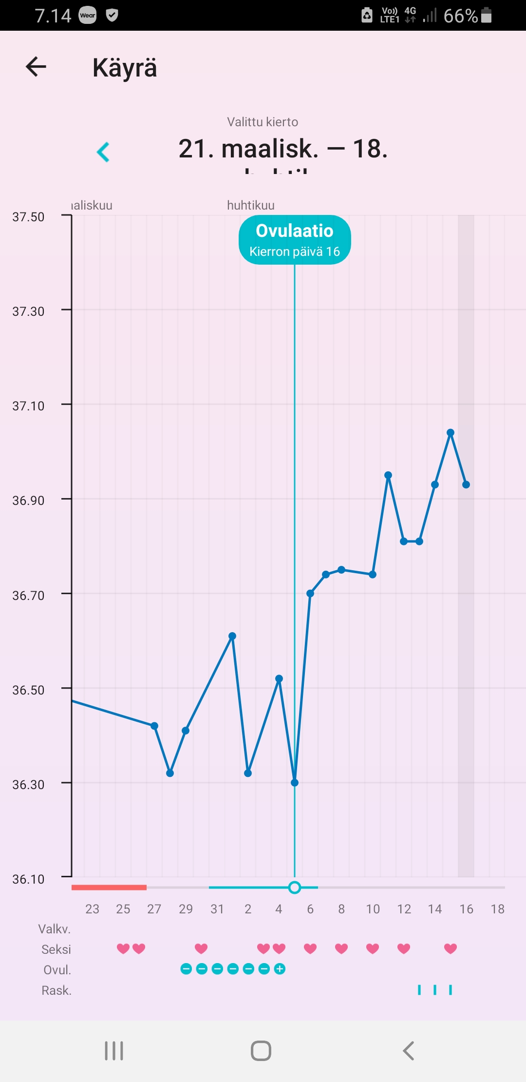 eka ja toka näytti ehkä 36,34 ja 36,41'C jos se ei ollut unta, ja sitten kolmas kerta heti perään 36,24'C. Jos merkkaan ekan tai tokan lämmön ja poistan alkukierron korkeat lämmöt kokonaan, FF merkkaa katkoviivoin oviksen kp13:sta jolloin oli se dippi. Jos taas laitan tuon alemman lukeman, ei FF merkkaa ovista laisinkaan vielä. Taidan tän päivän jättää lämmöistä kokonaan pois kun meni mittailu pelleilyksi.Mun mielestä on yleensä riittänyt 3 peräkkäistä korkeampaa lämpötilaa. Ja jos tikuttanut niin viimeisin ovis plus jälkeinen päivä ovulaatio (joskus näyttänyt 3 päivää plussaa ovis tikku).Tässä mun päivitys, eiköhän se nyt siis ole dpo3eilen tosiaan join pari lasia punkkua illalla ja valvoin kolmeen asti, joten ei kaikista luotettavin tulos tähän päivään