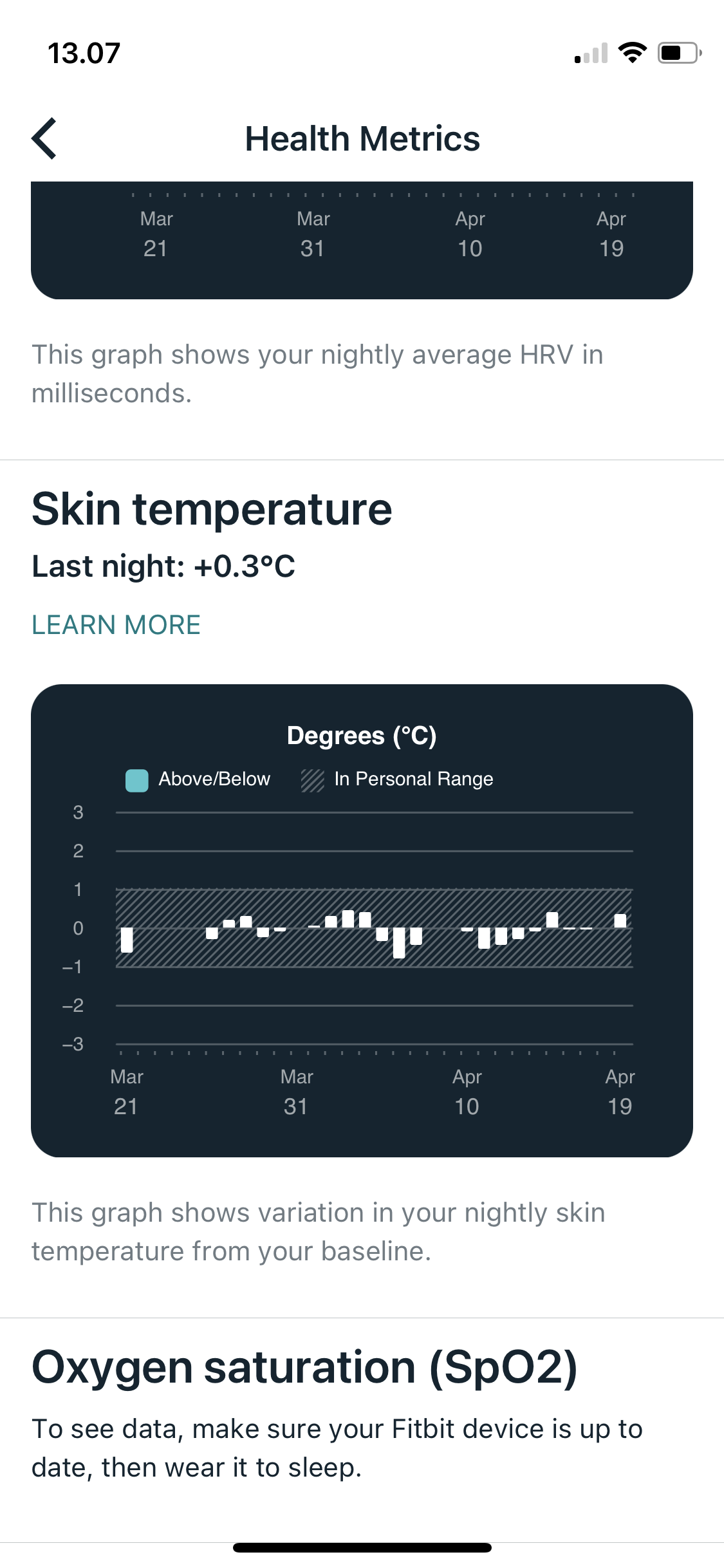 Mulla on kans fitbit (charge 5), ja ilmoittaa joo lämpötilan vaihtelun keskimääräiseen lämpöön verrattuna (mutta ei missään kerro mikä se keskimääräinen lämpö on). Mä käytin kans tätä parissa ekassa kierrossa synnytyksen jälkeen, mutta oli mun makuun sit vähän liian epätarkka, joten palasin normi kuumemittariin, joka mulla tosin vaan yhden desimaalin tarkkuudella. Jos tarkkuudeksi riittää, että voi kierron lopussa todeta, että mahtoiko ovis tosiaan tapahtua, niin kyllä se siihen ihan hyvin sopii. Tolla fitbitillä tulee joitain satunnaisia nousuja ennen ovista ja toisaalta sit myös epämääräisiä dippejä oviksen jälkeen, mitä ei sit kuitenkaan kuumemittarilla mitatessa näe, niin sen takia en niin tykkää käyttää tota fitbitin mittausta päivittäisessä käytössä. Laitan tähän mun viimeisen 30 pv käppyrän fitbitistä, niin siinä näkee, että tossa kuun vaihteessa oli luteaali aika, mutta siinäkin lyhyessä ajassa mikä mun luteaali on, oli aika monta matalaa arvoa, kun taas kuumemittarilla mitattuna oli ihan selkeesti koholla lämmöt koko sen ajan.