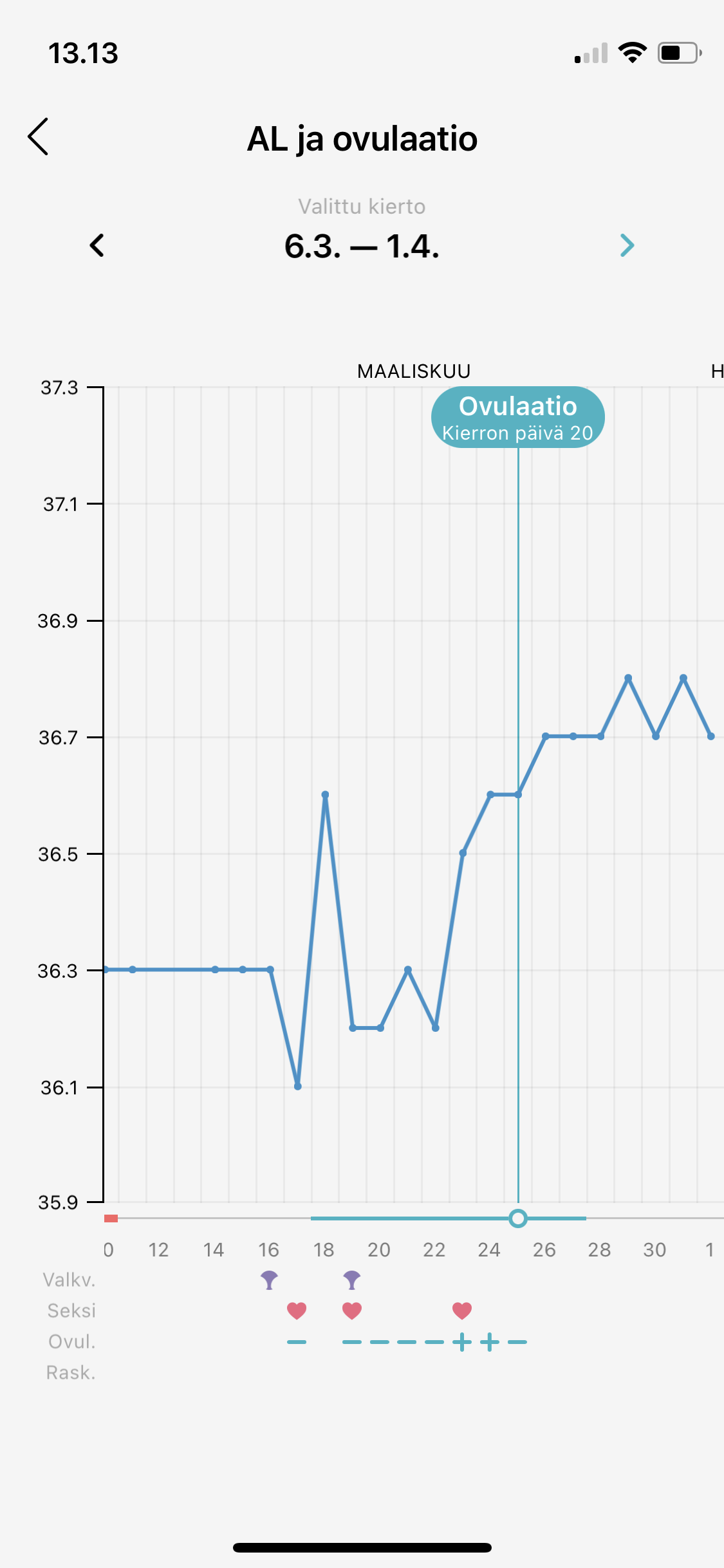 Harvoin edes tulkitsi ovulaation (tuo sininen pallura alhaalla on testillä mitattu..)