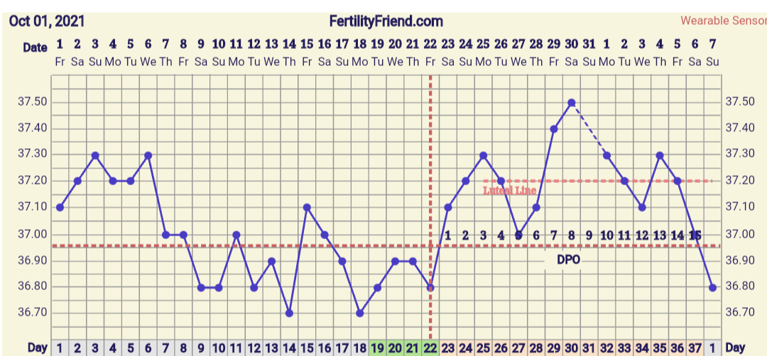 "The Luteal Line is a graphical tool which allows you to better see trends in your luteal phase (after ovulation) temperatures. It is displayed as a dashed line on your BBT chart. The line is calculated based on your luteal phase temperatures."