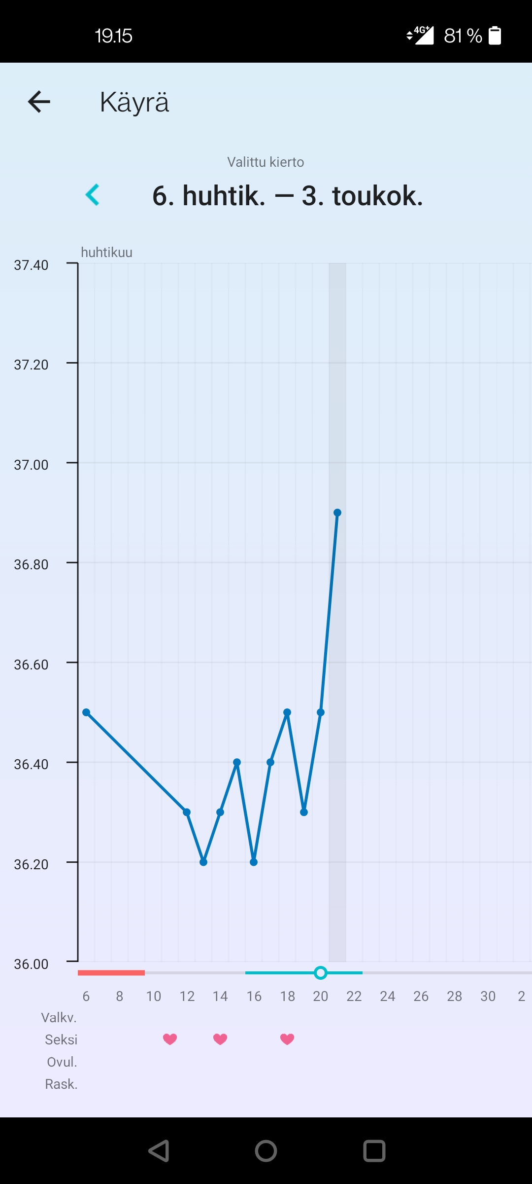 Tänään nousi lämmöt kunnolla, eli ovis oli varmaankin tiistaina testien ja käppyrän perusteella. Varmaan jätän sitten kyllä lämpöjen mittaamisen joksikin aikaa, kunhan Flo saa myös oviksen laskettua, etten stressaisi niistä. Muutenkin saattaa vaikuttaa, kun meillä on just aika iso keittiöremontti menossa, joka osaltaan vaikuttaa stressitasoihinkin. Olis kyllä kätevä sellainen laite, jota pidetään yön ajan käsivarressa mittaamassa lämmöt ja jos se vielä automaattisesti siirtäisi tiedot johonkin sovellukseen, josta ne voisi vaikka kierron lopussa kerralla kaikki hakea. Ei tarvisi joka aamu niitä itse mitata ja katsoa, kun kyllähän se lämmön lasku yleensä ainakin vähän lannistaa jos niin käy. Youtubessa olen kyllä jotain tällaisia laitteita bongannut, esim. TempDrop, en tiedä onko täällä saatavilla.