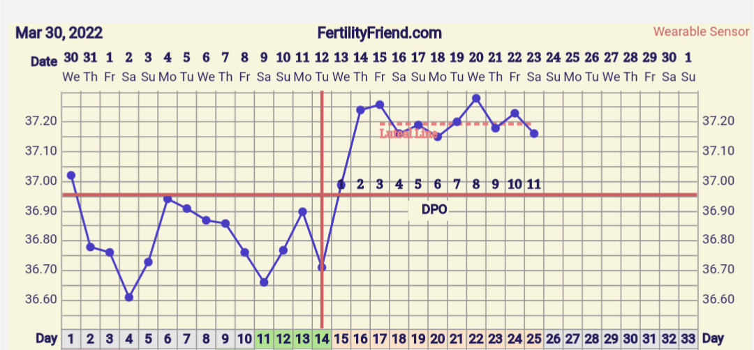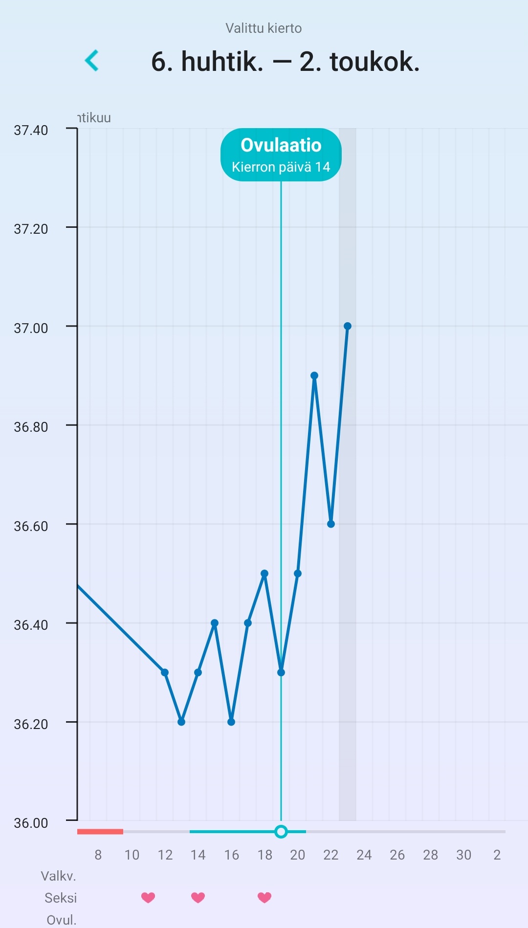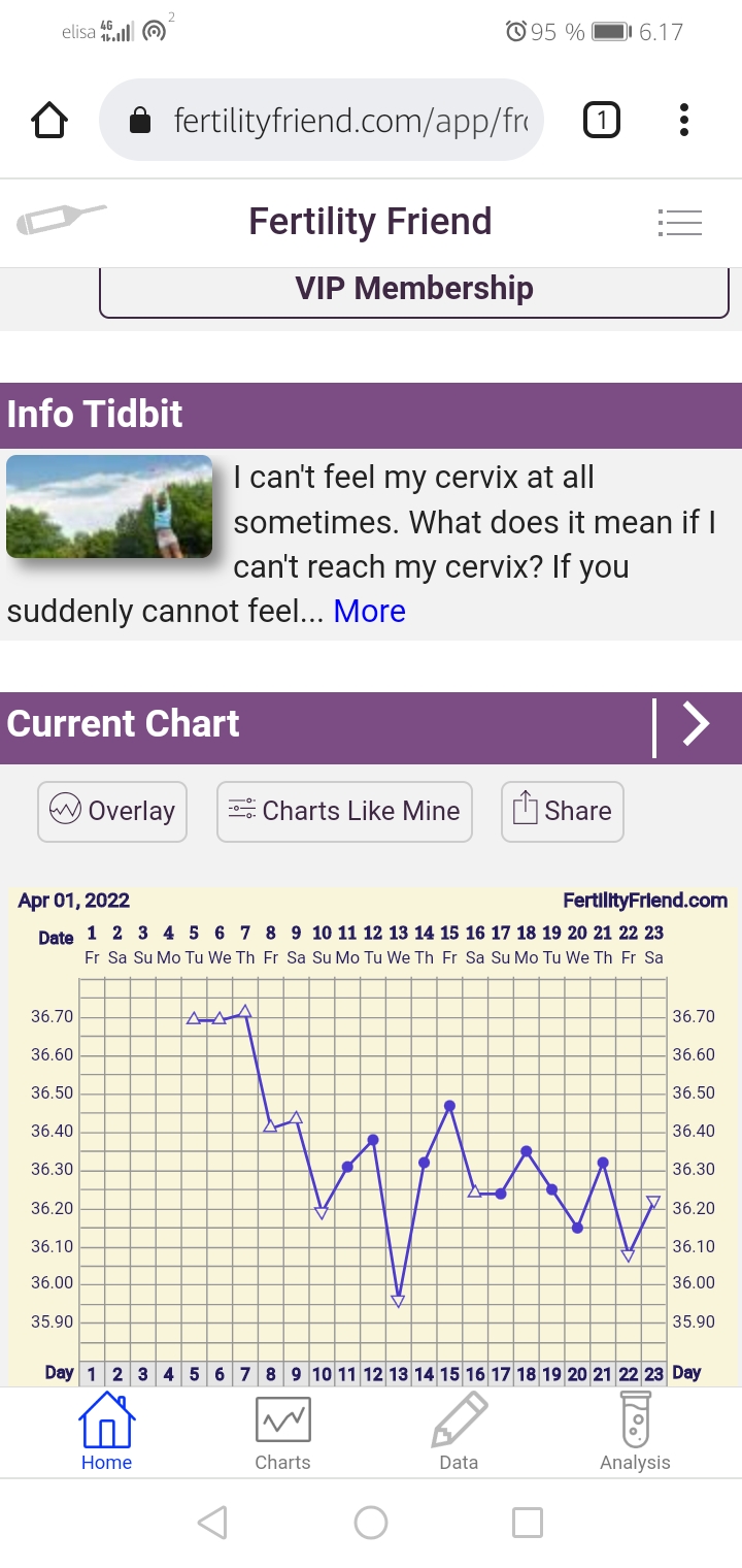 Hei mites tässä että vieläkö on ovis tuloillaan vasta vai oliko. Heräsin 1:30 ja mittasin lämmöt, niin oli snadisti nousussa, 5:30 kokonaan herätessä oli puolen asteen nousu eiliseen. Ajattelin että ovis oli yöllä, mä kun nopeasti ovuloin yleensä. Laitoin ekan lämmön FF:n, vaikka normaalisti mittaan klo 5.