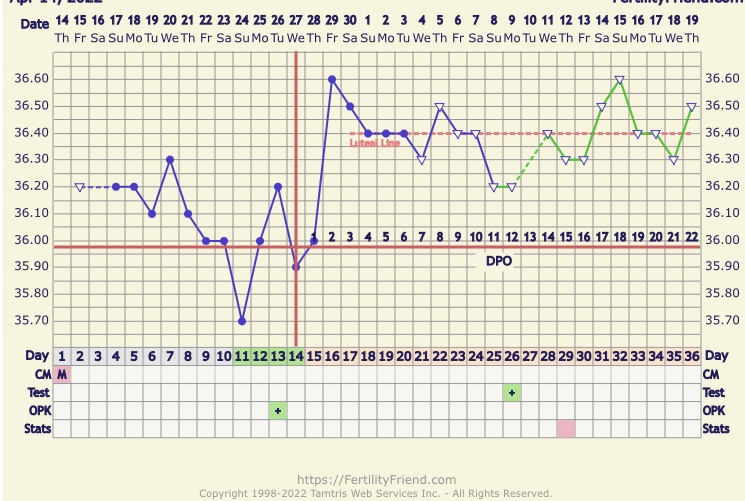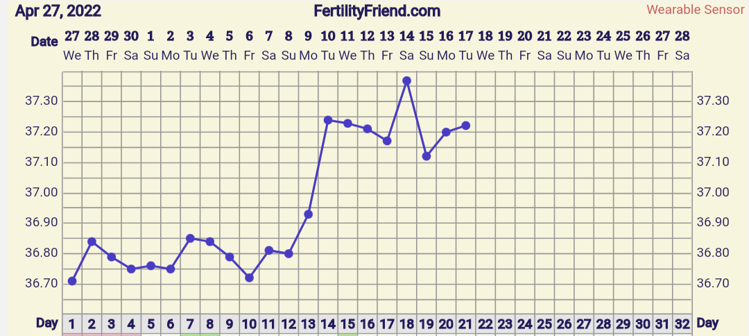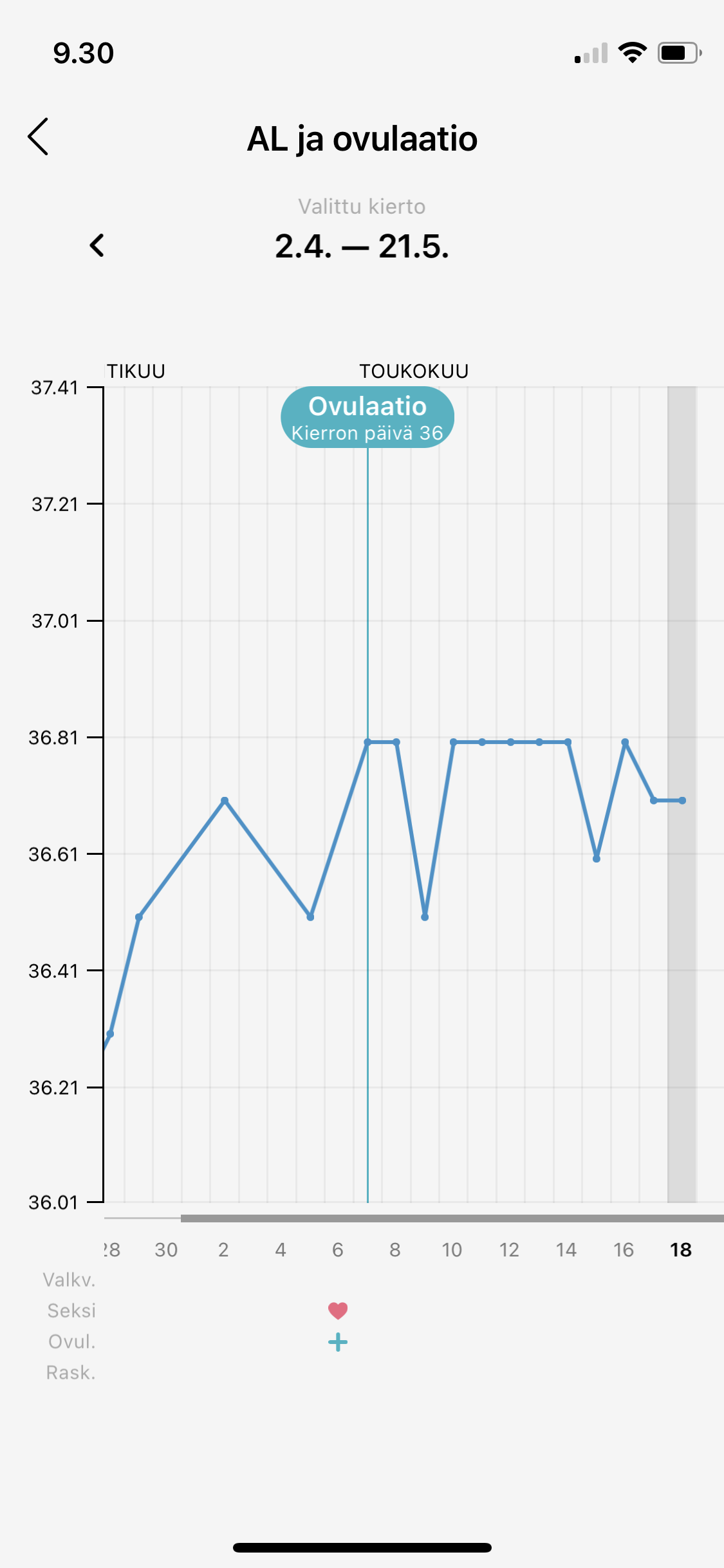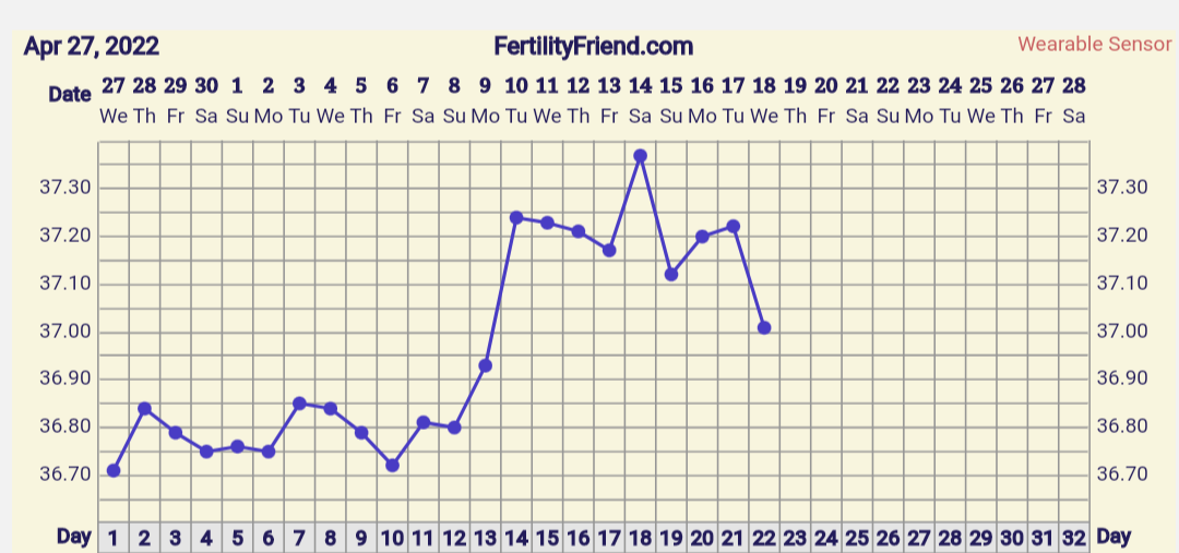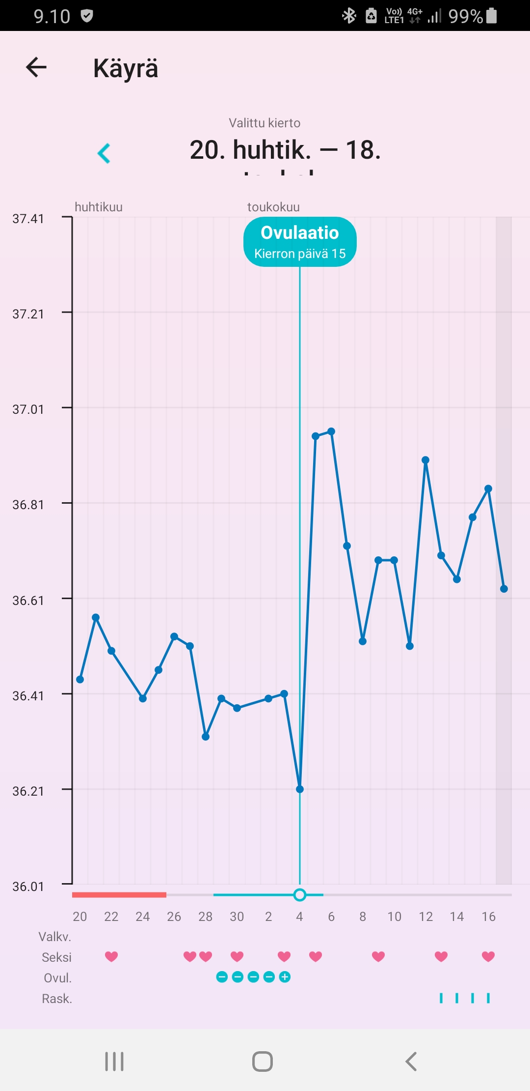 Mä en varmaan muistanut tulla päivittämään, että mulla ei ne menkat alkaneetkaan, vaikka oli silloin reilu viikko sitten hirveitä menkkakipuja ja testikin haalistui yhdeksi päiväksi. Sen jälkeen muilla testimerkeillä viivat vahvistui hyvin. Toivotaan, että tämä olisi nyt vihdoin se pysyvä plussa 🙏🏼 Tässä vielä kuvaa tämän kierron lämmöistä.
