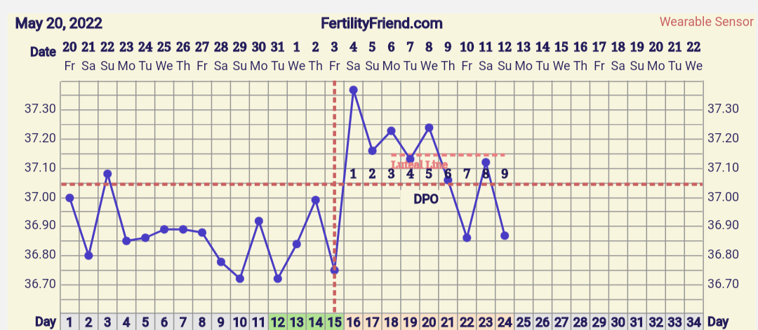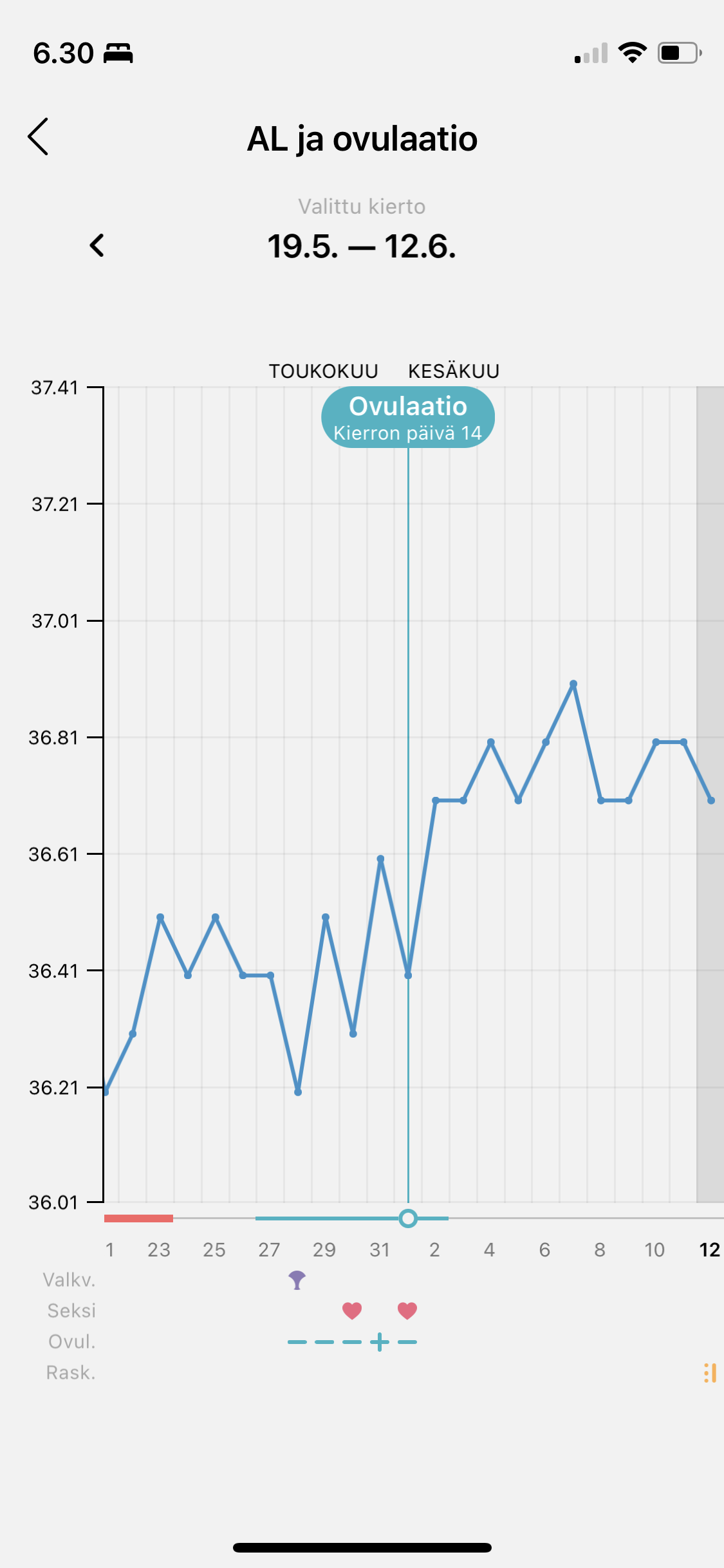 Mun lämmöis ei kyl oo ny mitää järkeeFF:kin oli kohtelias ja siirsi tota alaviiva alemmas että pysytään sen yllä. Mut nää on sellasia lämpöjä millä muissa kierroissa on menkat alotettu. Jos tänään alkais menkat, ja olis normaali luteaali, ni ovis olis ollu sillon ku sain tässä kierrossa ekan hitusen tummenneen ovistestin, mikä ei kuitenkaan ollu plussa vielä. Ei kai sillon vielä voinu olla ovis, en kyllä millään usko :D eli joko on lyhentyny luteaali täs kierrossa tai lämmöt menny nii sekasin ettei ilta-aurinko paista.