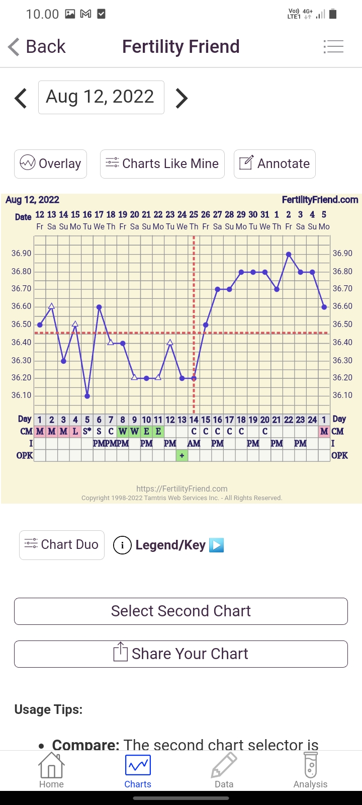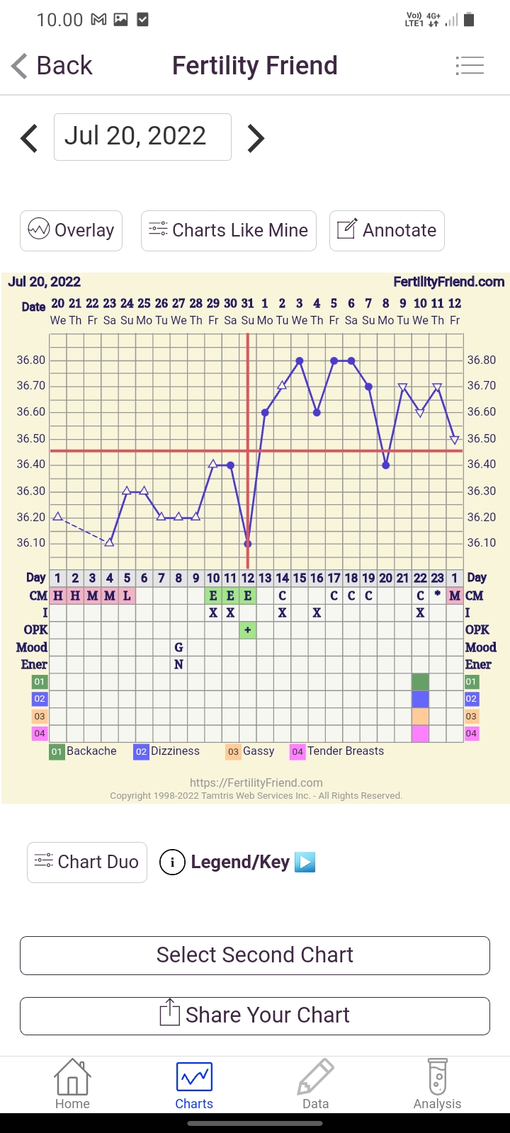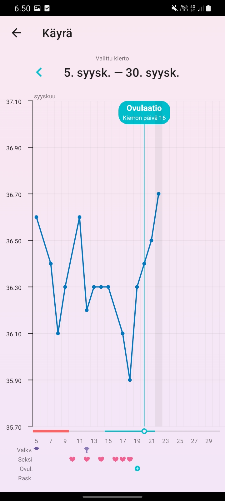 Ei auttanut lupaavan näköinen käyrä ja triphasic pattern, tänään kp 1. Mutta nyt takana ensimmäinen kierto lämpöjen mittausta, ja tämähän on kyllä mielenkiintoista. En olisi uskonut, kuinka selkeä käyrä tulee, vaikka toki jotkin epäsäännölliset heräämisajat tuolla vähän aiheuttavat heittoa. Ensimmäistä kertaa uuteen kiertoon joutuminen ei tuntunut ihan niin pahalta kuin yleensä, koska tähän kiertoon ei oikein ollut mitään odotuksia. Sairastimme reilu kuukausi sitten miehen kanssa molemmat koronan korkealla kuumeella, joten siinä kai menee aikansa ennen kuin edes siittiöitä on taas tarpeeksi, jos ne ymmärtääkseni tuhoutuvat kuumeessa.