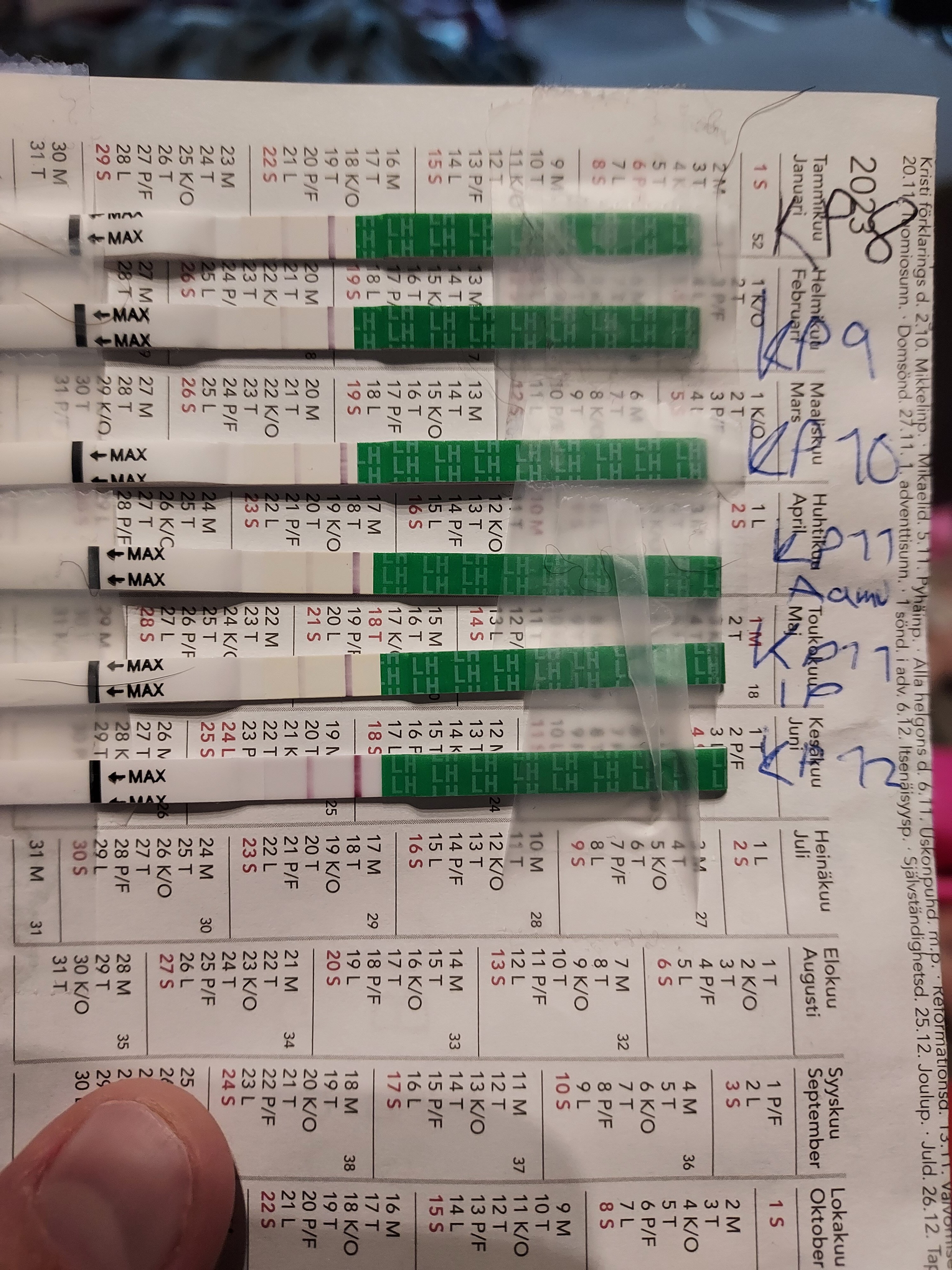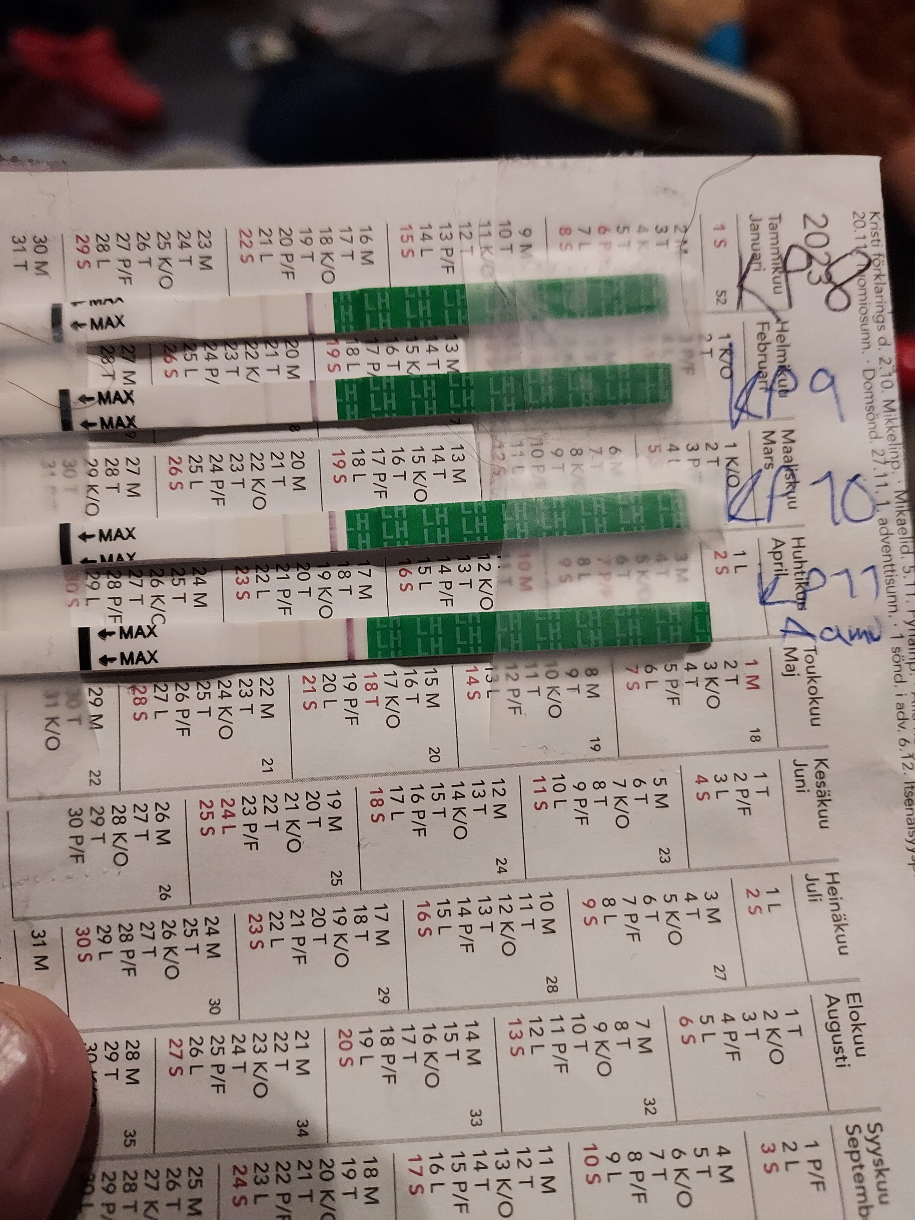Hitto tein aamul ovistestin ku hirmunen himotus päällä ja ihmettelen kun ei iltapäivien testit muutu yhtää tummemmaks ettei vaan huippu mene ohi, mut sit huomasin että kello on kamalasti ja pitäs töihi juosta jo eli en kerenny jäämään katsomaan tulosta 😂 lämmöt vähän pomppas mut nousin koirat käyttää 2h ennen kellon soittoa ni ei ihan ehkä aito tulos. Mut ei kyllä ota yhtää selkoa milloin ovis, onko normaaliin aikaan vai taas vähä myöhemmin.