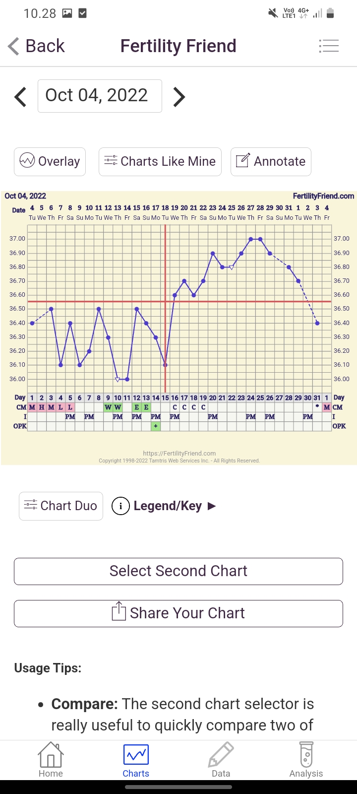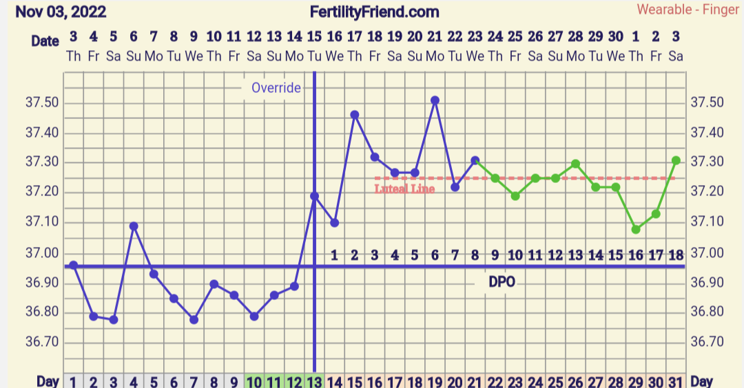 Tänään siis kp13, ja lämpökäyrä näyttää myötäilevän edellisiä kiertoja aika hyvin, ja pikkasen on ovistestikin lähtenyt tummumaan, joten voi olla, että ovis tulee ihan ajallaan, se vaan hämää nyt tässä kierrossa, kun eggiksiä ei ole vielä näkynyt ollenkaan, kun yleensä ne alkaa lähes viikkoa ennen ovista