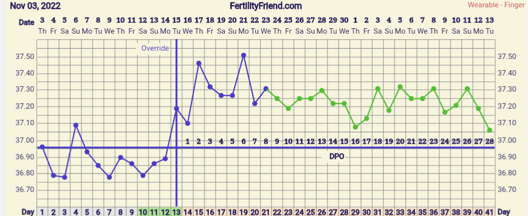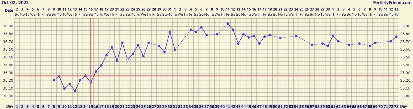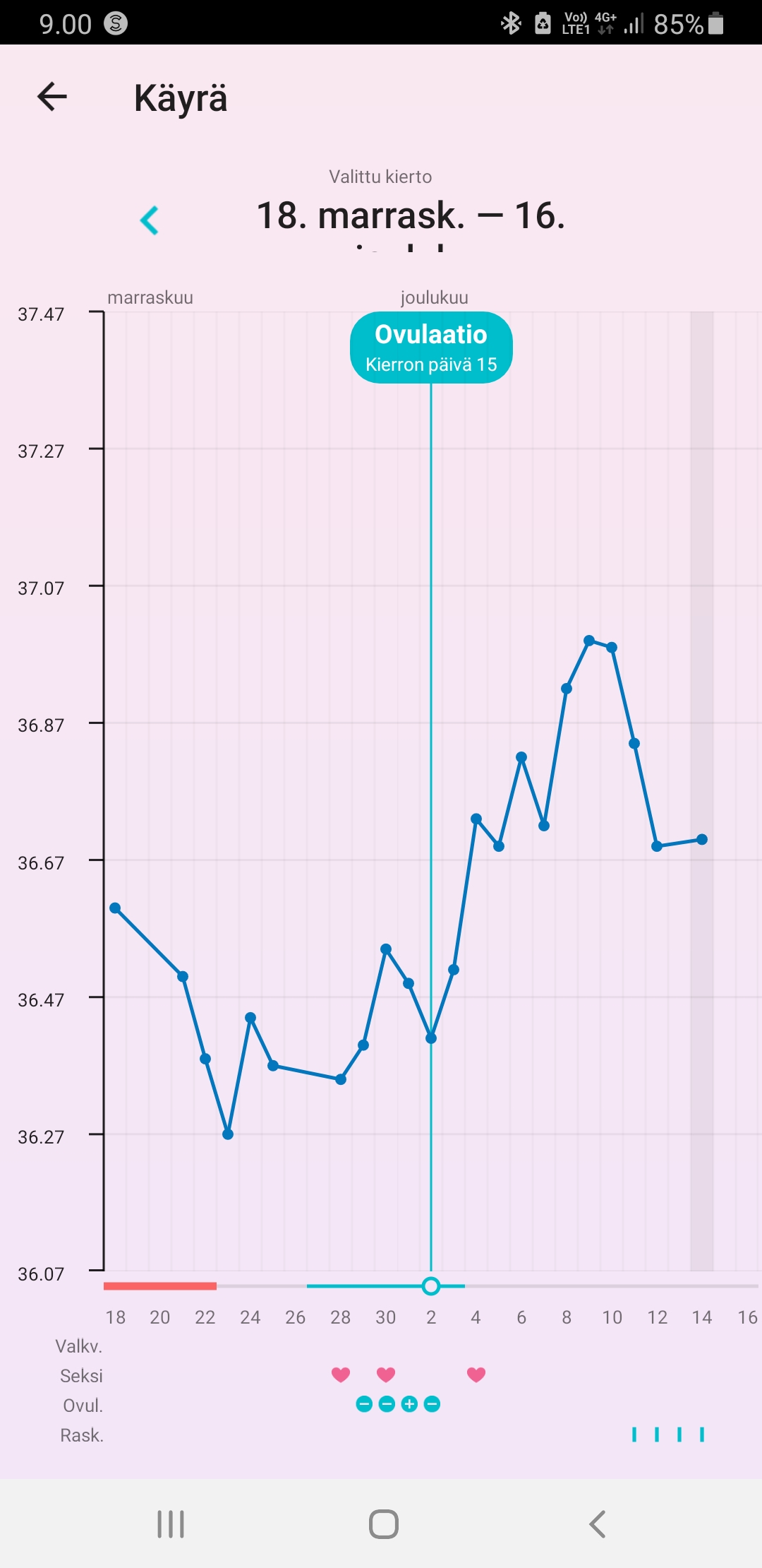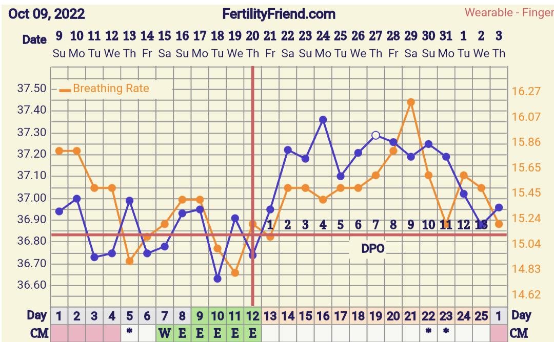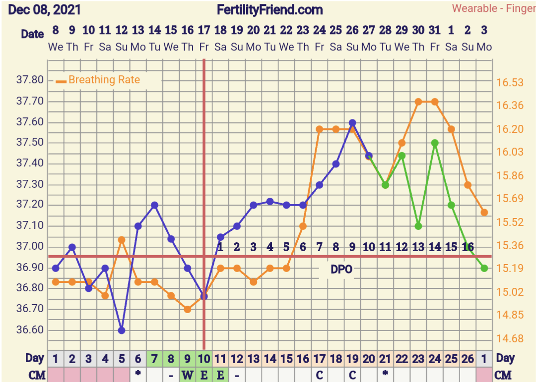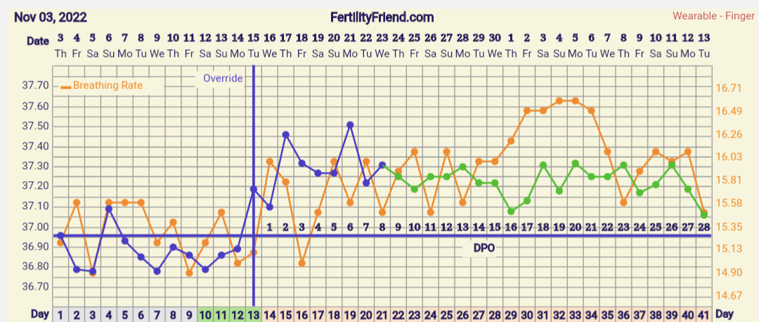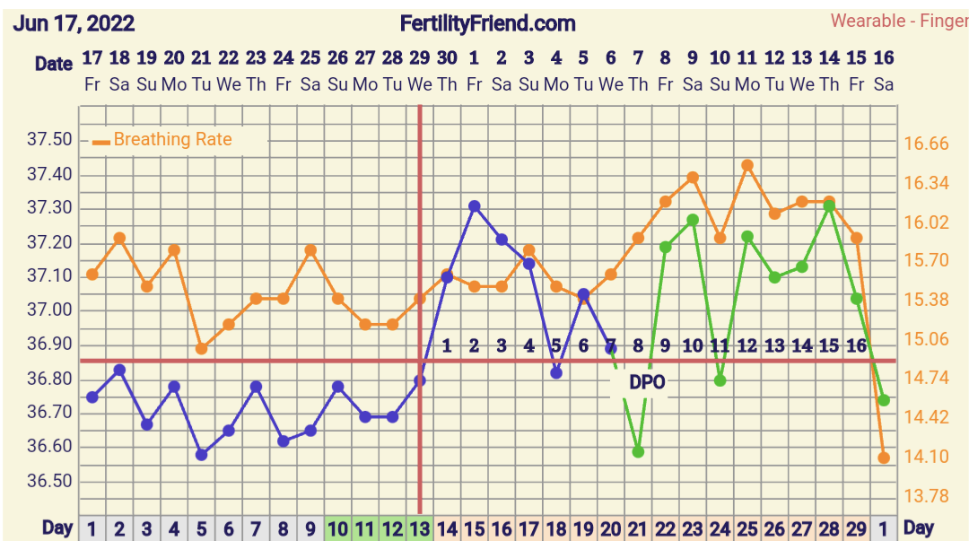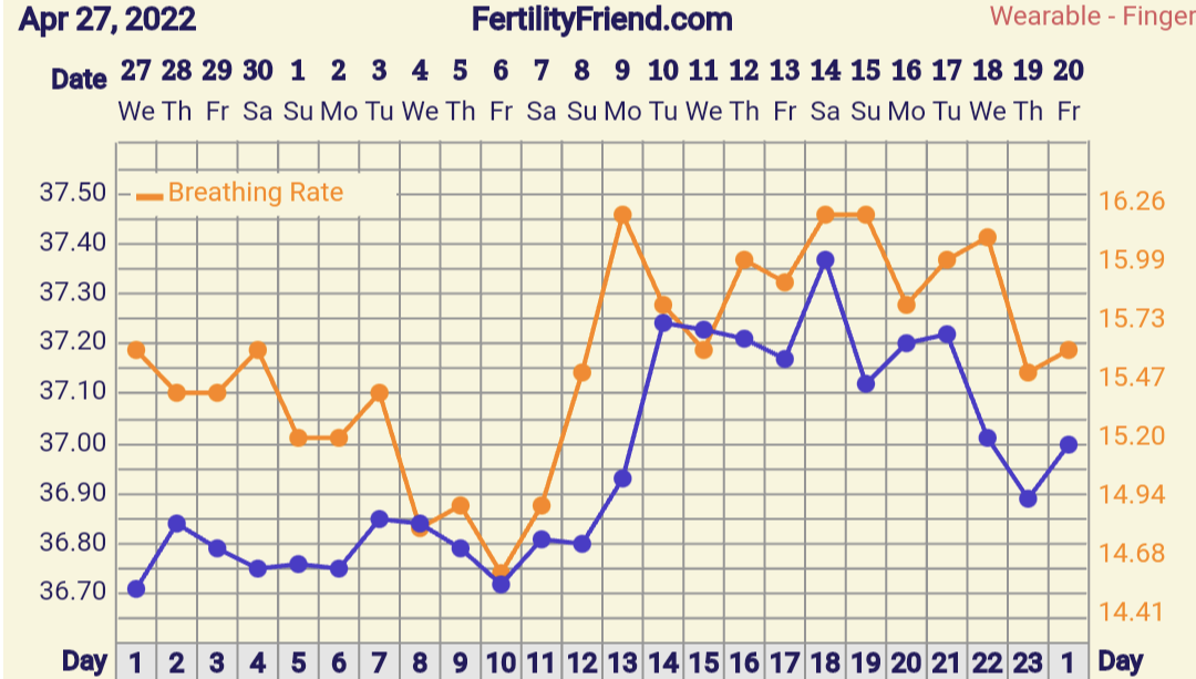 Jännän näköinen käyrä! Olisipa kyllä mielenkiintoista tietää mitä tuossa tapahtuu kun hengitystiheys nousee hurjasti ja jää ylös ja sit romahtaa. Olisiko se tosiaan ollut se varsinainen raskausoire sit ja olis jäänyt ylös jos olis jatkunut@Summerwalk mielenkiintoinen tuo rinnakkaischartti! Laitoin tälle kierrolle nyt hengitystiheyden ja näytti tältä: