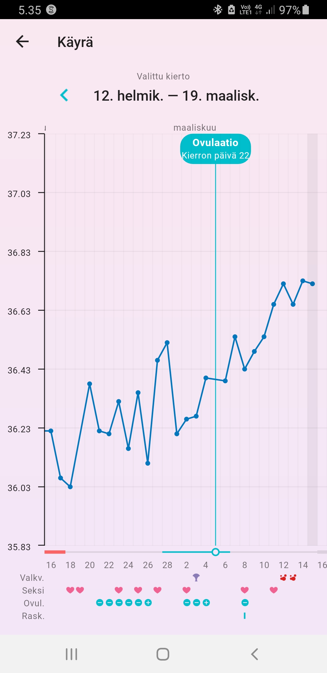 LĂ€mmöissĂ€kÀÀn ei kummallisuuksia, tasasen tappavaa normaalia luteaalia. Nyt siis dpo10 ja ovissekoilun takia pitkĂ€ kierto 32/30. Flo ennustaa menkkoja alkavaks maanantaille kp 37/30. Saas nĂ€hdĂ€! đŸ€“