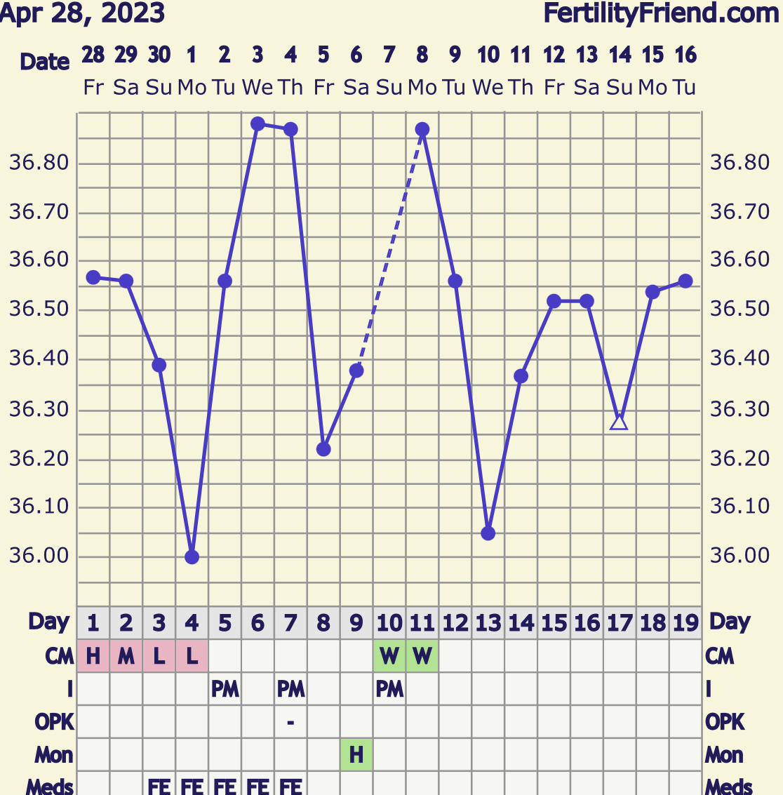 Omaa napaa: lämmöt dippasi ja tiputtelu alkoi. Ainakin varmistui se että ovis oli kp 15 (ei 16) kuten itse arvelin. Uutta kiertoa kohti siis, vähän rauhoittaa mieltä että on se gyne sitten tulossa.