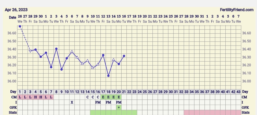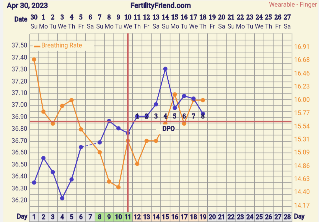 Täällä dpo 6/7. Edelleen uskon oviksen olleen päivää aikaisemmin kuin ff se merkitsee. Keskiarvokäyräkin puhuu sen puolesta. Hyvin menisi päällekkäin avg-käyrän kanssa jos siirtäisi ovista päivän taaksepäin.