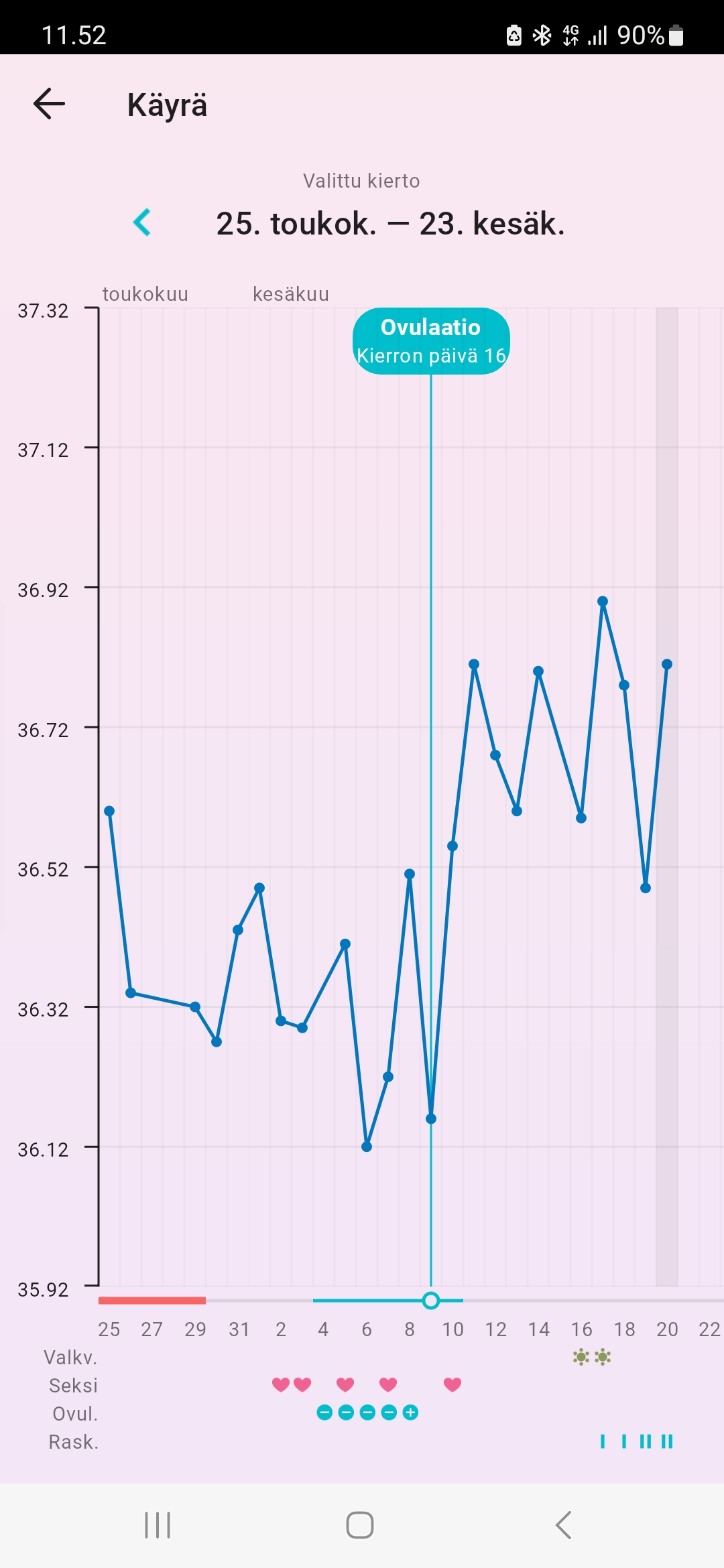 Se mikä on huomionarvoista ja mistä olen todella onnellinen niin ensimmäistä kertaa lähes vuoteen ei ovulaation jälkeen ole näkynyt mitään punaisen sävyjä vv:ssa. Ei siis tiputtelua ollenkaan