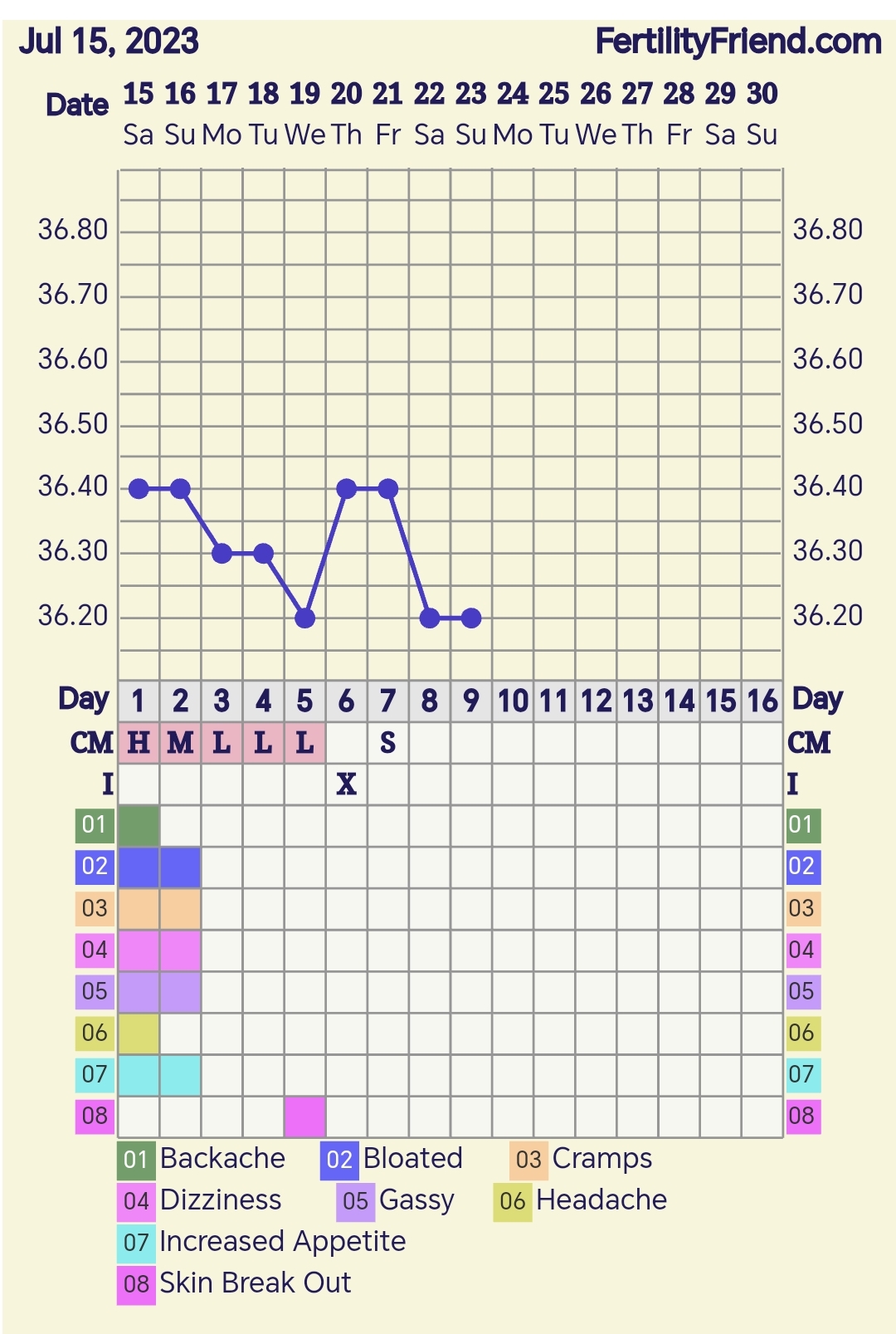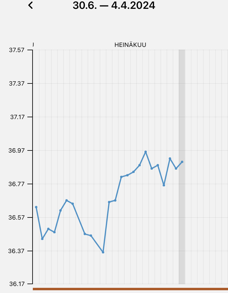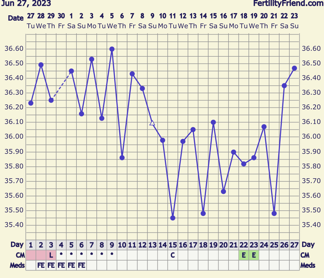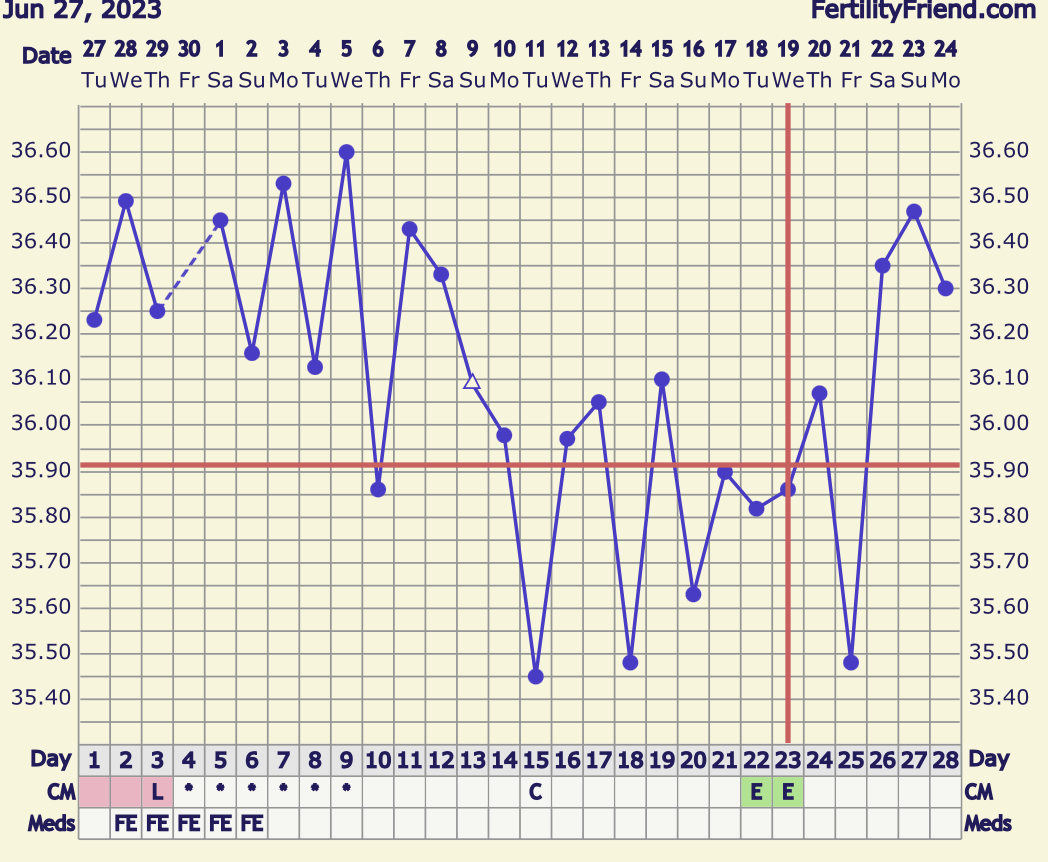 Mulla kyllä on vähän sellainen jännä olo, että ovis olisi kumminkin ollut jo tuossa kp22, jolloin olisi tallettelut dpo0 ja dpo-2. Oireet sopisi paremmin sinne. Saa nähdä. Tuo jännä tasaisempi pätkä lämmöissä oli tosi erikoinen. Nyt vaan jännätään tuleeko lämmöt samalla rytinällä alas.