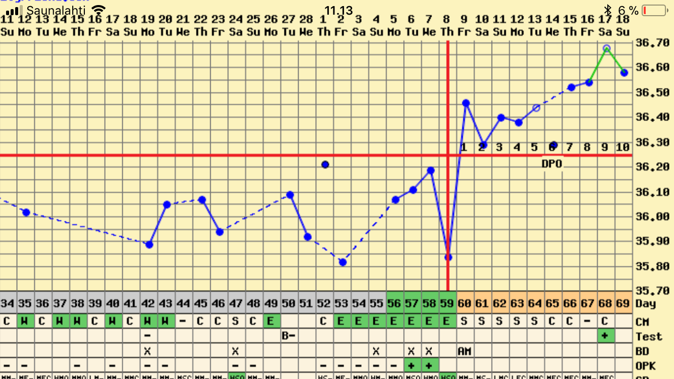 Ootteko käytelleet noita temperature correctoreita, jos ootte mitanneet poikkeuksellisen aikaisin tai myöhään? Mä heräsin tänään viiden aikaan, mittasin lämmön ja menin käymään vessassa. Sen jälkeen pyöriskelin hereillä varmaan tunnin, nukahdin uudestaan ja mittasin herätessäni seuraavan kerran n. 7.45. Viideltä lämpö oli 36,13 ja 7.45 36,59. Ero on musta yllättävän iso. Normaalisti herään ja mittaan noin 6.30-7.00. Oon joskus ottanu huomioon tollasen vähän ennen kahdeksaa mitatun lämpötilan, mutta nyt kun unta ennen mittausta oli vain n. 2 tuntia, sekään ei taida olla luotettava. Netistä katottu corrector sanoisi, että toi viideltä mitattu lämpö olisi korjattuna noin 36.3, mutta Ff ei ilmeisesti ainakaan pidä ajan mukaan muokattuja lämpöjä luotettavina.