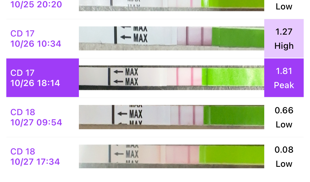 @Ness Hauska kyl, et sulla premom sanoo noista 0.66-0.78 testeistä low, kun mulla sano high. Et osaako se sit muokata niitä kunkin käyttäjän mukaan, et mikä kelläkin on low tai high. Jos sulla kerta tulee tosi vahvat viivat ovistestiin. Kiintoisaa. Mut joo mä en saanut iiiihan täysvahvoja viivoja, mut kyl se muuten aika selkeesti LH-huipulta vaikutti. Ja kun nuo viel noita epäherkkiä testejä. Ei oo ennen ainakaan tullut ylimääräisiä viivan vahvistumisia, kun aikasempia lapsia yrittäessä oon ovistestejä käyttänyt. Alla premomin LH-käyrä.