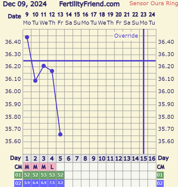 Kävin overrideemassa oletetun ovispäivän ja laitoin coverlinen ouran 0.0 tasolle. Jotenkin selkeempi musta seurata alkukiertoa näin. Vaihdan sit kun oikee oviksen paikka tulee.