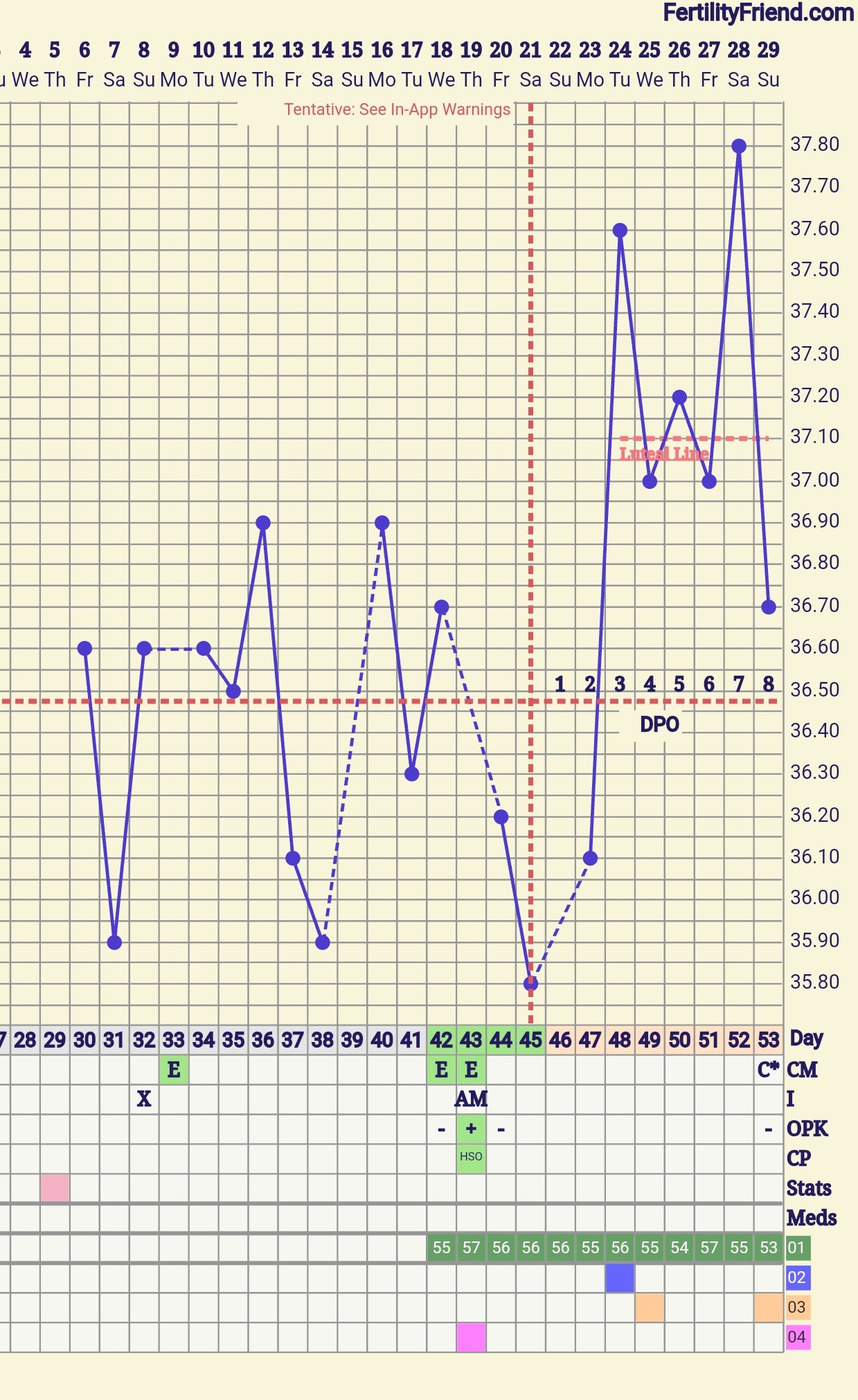 @Pogo tosiaan kun lämpö on noussu kolme päivää putkeen niin FF tunnistaa ovulaation ja merkkaa viivat. Ilmaisversiossa ei tuu dpo-laskuria automaattisesti, mutta loin sen ite Custom data - kohtaan ja merkkaan oikeen dpo:n samalla kun merkkaan lämmöt