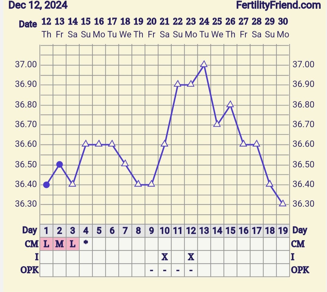 Noh torstaina ovistesti oli lähes plussa (premom 0.74), mutta on sen jälkeen haalennut, lämmöt myös lähtivät nousuun. Nyt en tiedä tapahtuiko ovista vielä vai yrittikö vain, merkkaanko tuon 0.74 testin plussaksi vai merkkaanko plussan joulupäivälle. Joulupäivän aamuna testi ollut 0.29, mutta periaatteessa lh on voinut nousta päivän/yön aikana. Harmiksi olen ollut vähän laiska testailemaan eli illalta ei ole testiä siltä päivältä ollenkaan. Unirytmi on myös myöhäisempi, joten siksi myöhäisemmät heräämisajat. Ei varmaan auta, kuin jatkaa mittailua ja testailua 🧐