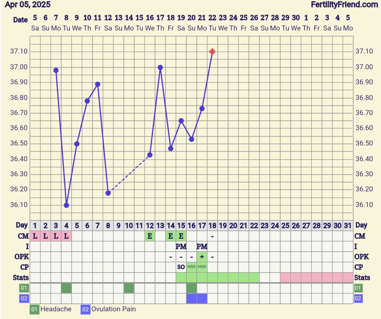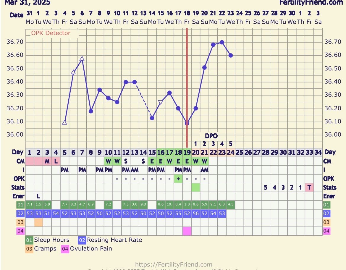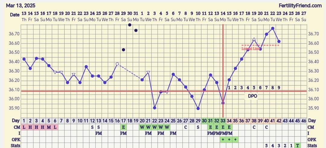 Mä kokeilin vaihtaa FF OPK detectorin, sillä osuu ovis tuohon testien peak tuloksen ja tuntemusten (Oli tässä kierrossa kyllä niin selkeät oviskivut ovisplussasta seuraavana päivänä 😅) kohdalle niin itselle helpompi seurata vaikka oikeasti yhdellä päivällä ei mitään väliä ole oikeastaan 😄 Advanced oli merkannut oviksen päivää myöhemmäksi siis. Mitään tuntemuksia suuntaan tai toiseen ei kyllä ole ollut vielä, jos nyt jotain yrittää hakea niin aamuväsymys ei oikein meinaa väistyä päivän edetessä mutta voi olla ihan normaalia luteaalivaiheeseen liittyvääkin. Pieni lasku tämän aamun lämmössä, mutta tulevat päivät näyttää mihin päin se siitä lähtee kääntymään 🤞
