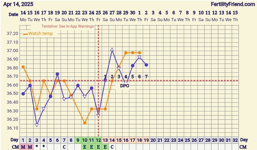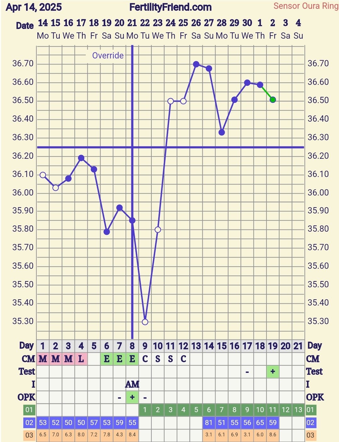Mä sain Ouran laturin takaisin, joten nyt on taas sitä dataa käyrässä. Välissä muutama päivä tavismittarilla mitattuna, mut aika lähelle menivät noita ouran lukemia, kun mittasin muutaman päivän molemmilla. Dpo7 taas dippi niin kuin lähes joka kierto, sit alko luget vaikuttaa ja lämmöt taas nousi. Mitään oireita ei oo ollu. Nyt on sattunut viel aika sekoiluviikko. Lauantaina oli viini-ilta kavereiden kanssa ja menin vasta viideltä nukkuu. Ti-ke yönä tein poikkeusyövuoron, niin unta ei oo siinäkään paljoakaan. Sit viel vappu tähän väliin. Testasin vappuaattona (dpo9) negan, et voisko vähän skumppaa ottaa. Vappupäivänä en jaksanut edes testata kun ei ole mitään oireita ja mahkut oli niin huonot muutenkin.