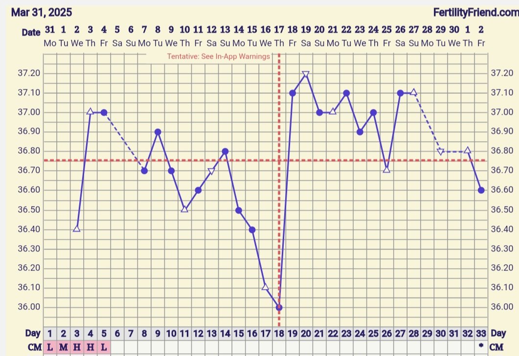 Menkat alkoi tänään töissä, voi sitä hymyn määrää. 😄 Viuh! Tämmöinen käppyrä tuli tästä nega kierrosta (kierron pituus 33 pv), laitan tänne jos jollekulle apua. Eli mä en raskaunut tästä kierrosta vaikka ovisplussa FF:ssä kp17/18 ja testit näytti hymynaamaa (kp 15 ja 16 ) ja talletteluja oli useita. Lämpötilat lähteneet laskuun eli merkki menkkojen tulosta.