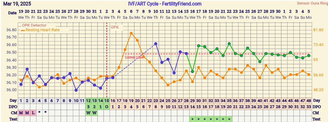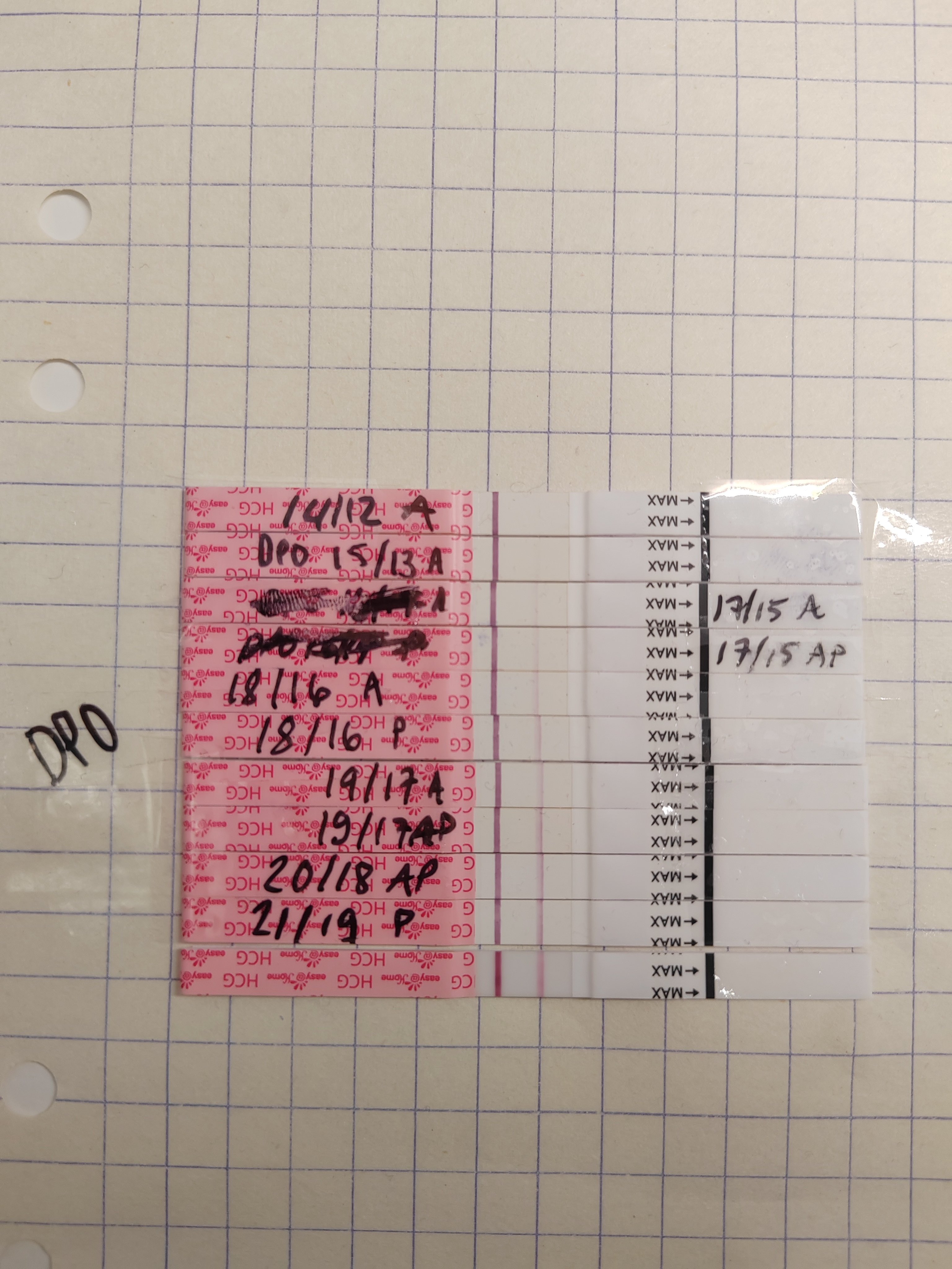 Tässä lömpökäyrää, punaisella merkkasin oviksen kun se viiva hävis tosta kun vaihdoin Flon raskauden seurantatilaan. Ja la, ma aamujen sekä eilisillan lyhyen pidätyksen RFSU testit, ei ollu muita lähikaupassa.