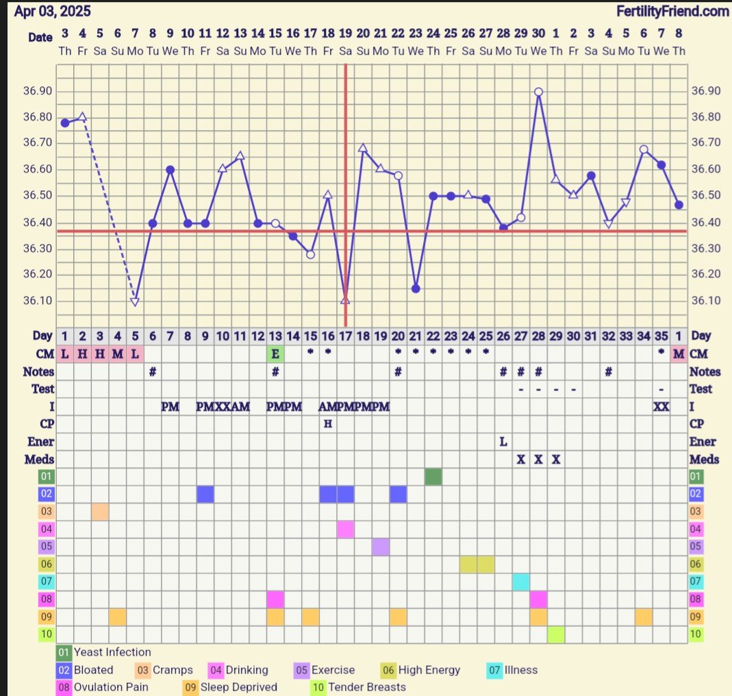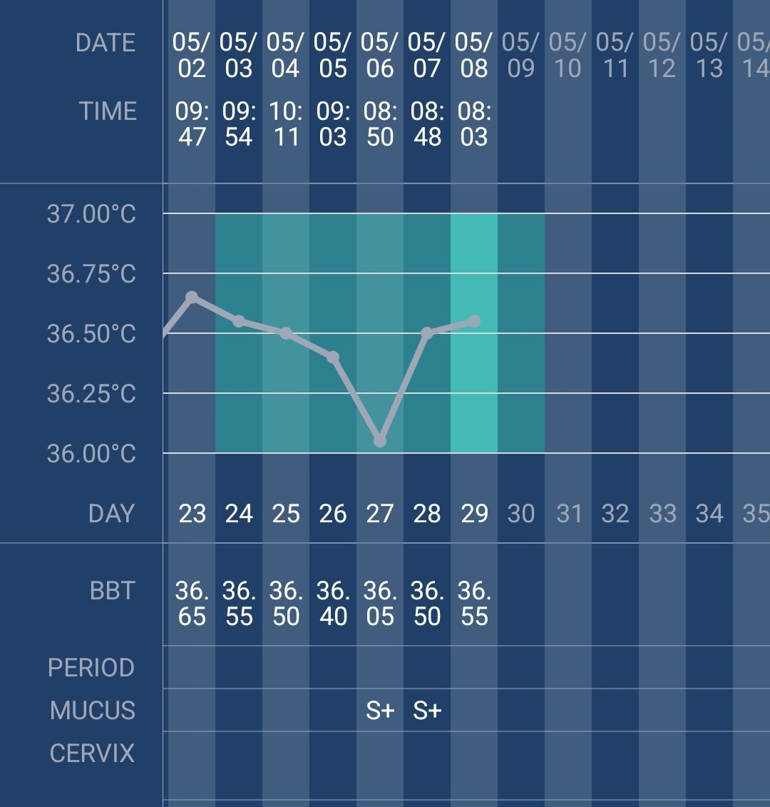 Odotan huomista pomppua lämpötilassa! Ainakin jomotusten perusteella ovulaatio oli eilen illalla vaikka Ovy ennustaakin sitä tälle päivälle tällä hetkellä. Toisaalta ehkä jos se on ollut kello 20 tai sen jälkeen se meneekin laskennallisesti tälle päivälle? 🤔