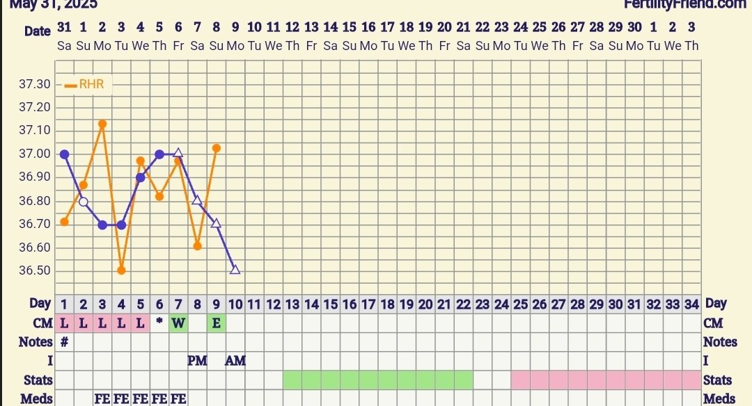 En ymmärrä näitä heittelyjä nyt yhtään, taas tultiin roimasti alaspäin ja alhaisimmat dpo7 lämmöt sitten hetkeen😵 jos tää keltarauhanen on jotenkin viallinen, niin alkaispa uusi kierto nopeammin, koska seuraavat kaksi ovista tosi ikävästi sattuu just niihin hetkiin, kun on menoja tiedossa!😢 sen suhteen voisi vähän aikaistua kierrot 🫣 ja jos uusi kierto alkaisi nopeampaa, niin ei tarvisi myöskään enää vuotaa juhannuksena😅 saapi nähdä miten nyt loppukierto menee!