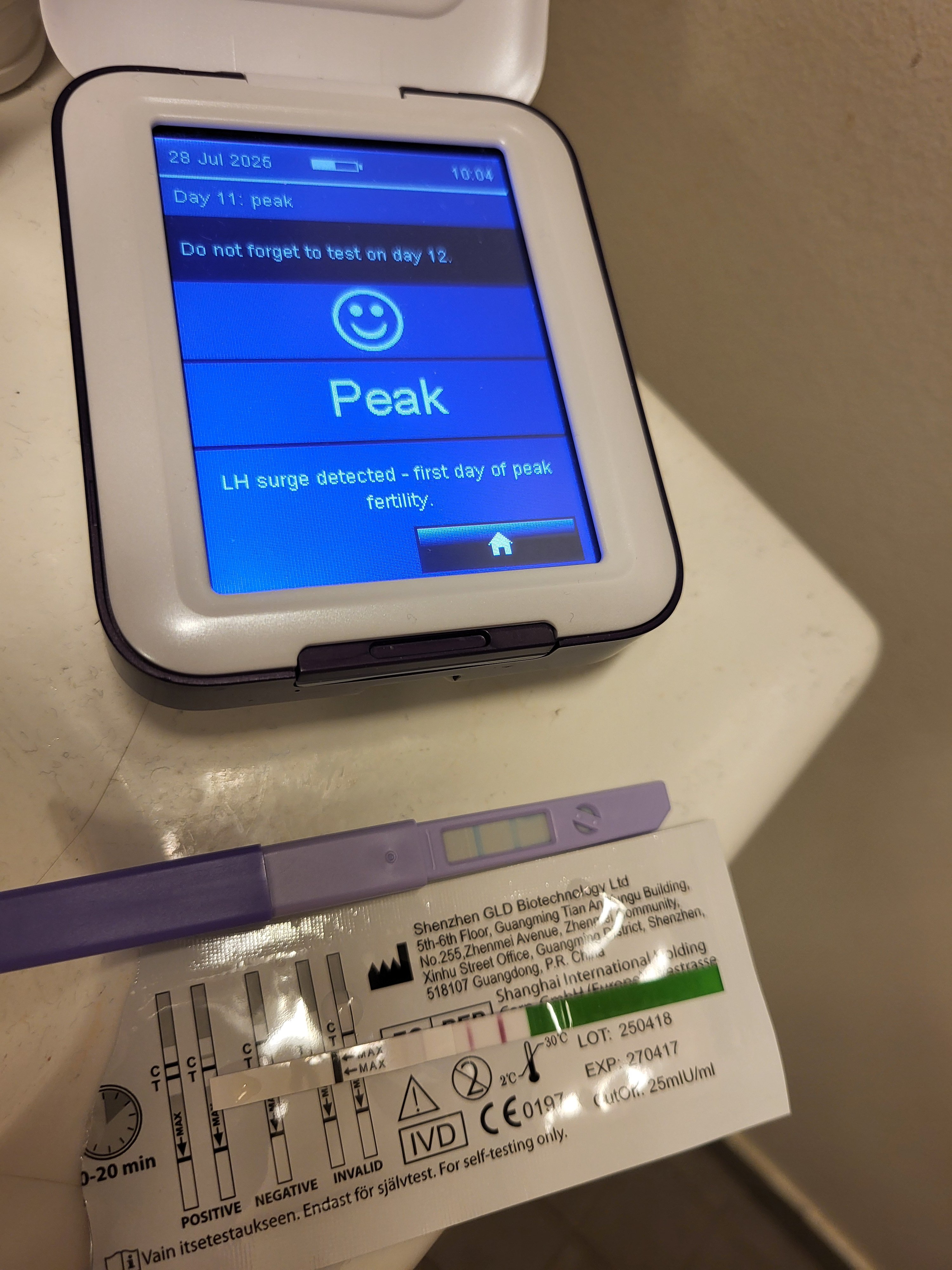 Sen jälkeen se pyytää testaamaan ovistestillä joka aamu ensimmäisestä virtsasta KP9 alkaen. Päivääkään ei saa missata tai pitää odottaa seuraavaa kiertoa. Siihen voi itse valita sen 12h testausikkunan, mulla on 06:00-12:00.