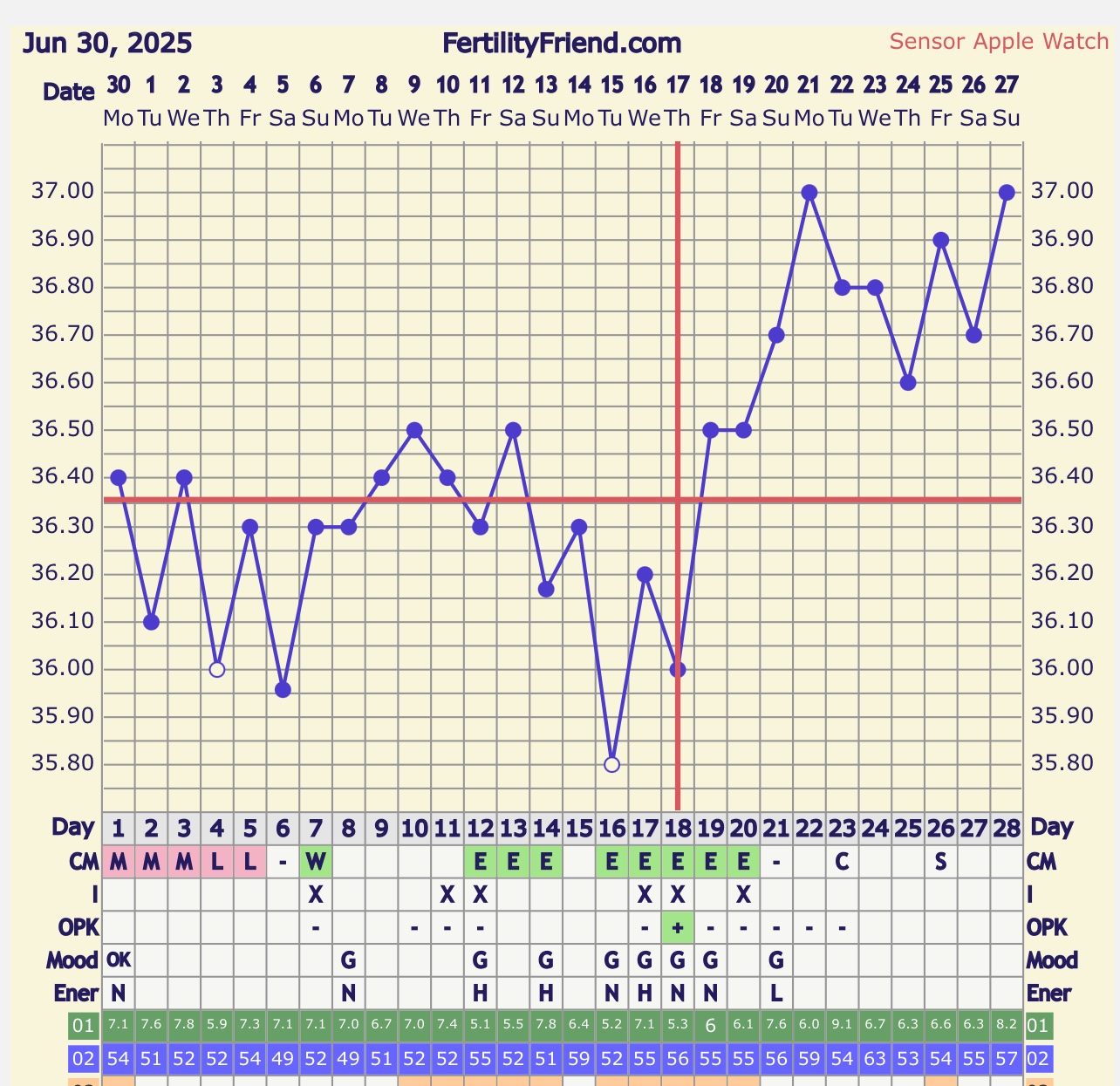 Pitäähän se vapaapäivänäkin herätä samaan aikaan mittaamaan lämmöt ja jatkaa sen jälkeen unia. Lämmöt droppasi aiemmista mutta silti selkeästi tuon punaisen viivan yläpuolella. Mä niin toivon että tää ois joku luteaalivaiheen kiinnittymisdippi kun aikataulullisesti sopis hyvin siihen.
