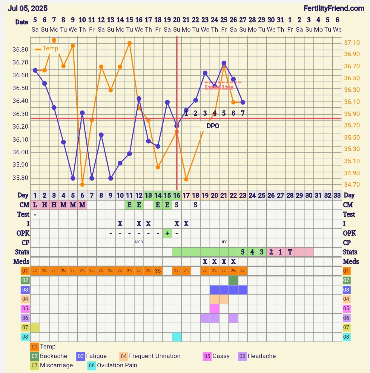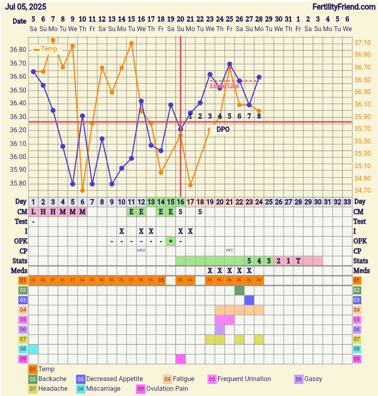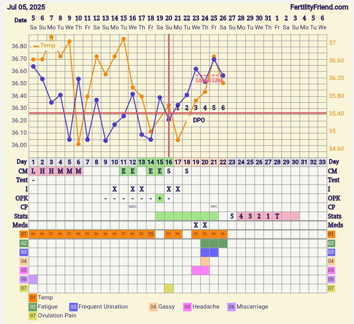 Mulla alkoi loppupeleissä kuukautiset pari päivää ovulaation jälkeen. Lämpötila ja ovulaatiotesti olivat sitä mieltä että ovulaatio oli sattunut hyvin hyvin myöhään… mene ja tiedä sit kun aloitin mittauksen hyvin myöhään.