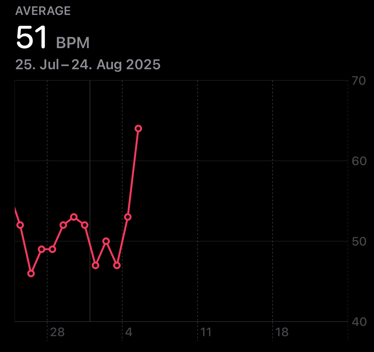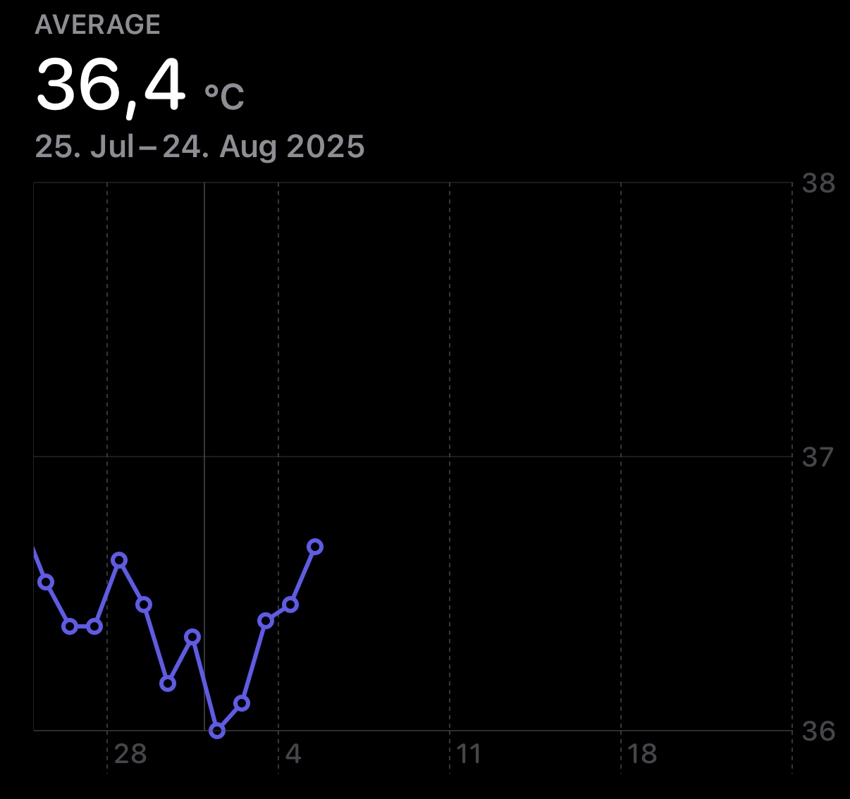 Edit lisäsin mahdollisesta mielenkiinnosta leposykkeen ja kehon lämmön käppyrät 25.7.-5.8. ajalta, mikä on ollut kierto tähän mennessä. 1.8. oli syljestä ovulaatioplussa ja 3.8. oli keskellä päivää aivan aavistuksen tummempi LH testiliuska, mutta ei lähelläkään ohjeissa kuvattavaa positiivista.