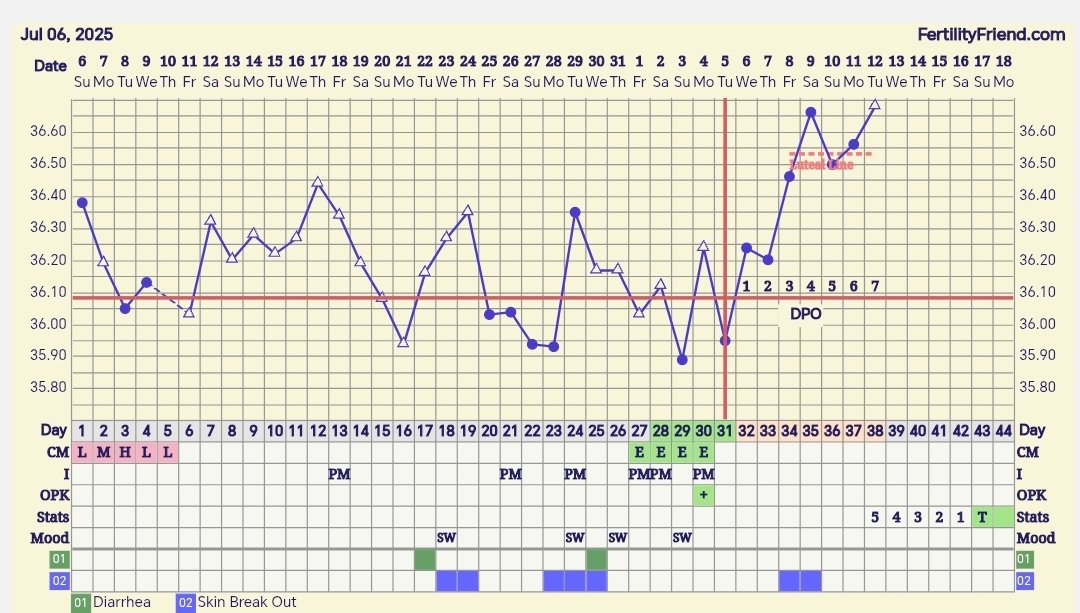 Punainen pampula ilmestyi jo käyrälle, eli lämmöt nousussa. Eilisen inssissä ei ollut vielä folli puhjennut, mutta oli suurehko 24mm molluska. Eiköhän se sieltä aika pikaisesti lähtenyt liikkeelle 😃 Mulla oli muuten tässä kierrossa ihan sairaan kovat oviskivut sunnuntaina. Koko alavatsa ihan törkee pallo ja tuikki koko illan. Itse ovispäivänä ei kuitenkaan mitään kipuja 😃 Varmaan letrot asialla.