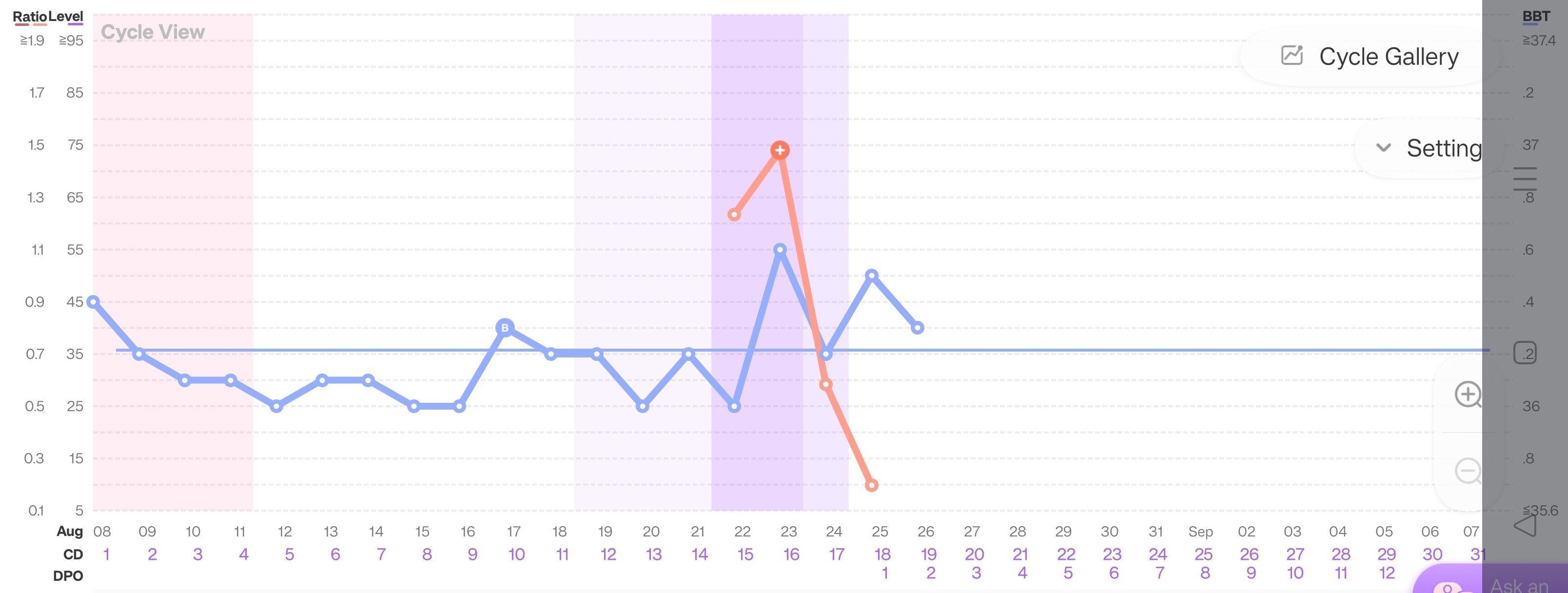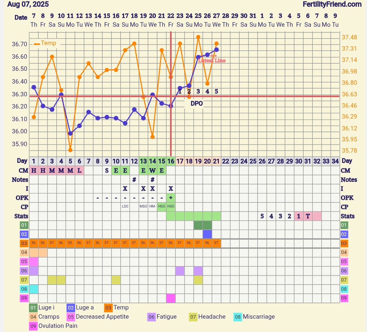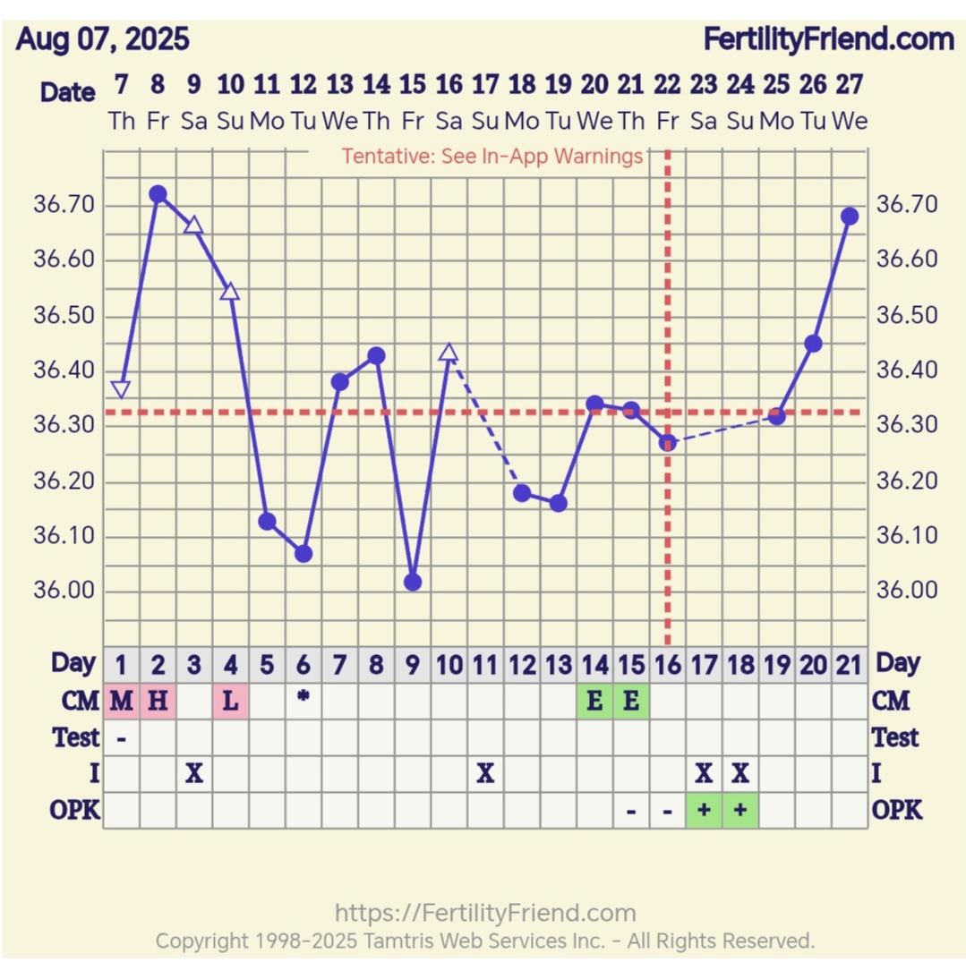 Mulla tuli poikkeuksellisen matala lämpö tänään, olisiko tuo sekundaarinen estrogeenin nousu kuitenkin? Ovis kuitenkin oli tuolloin kp11, vaikka FF sen punaisen rastin nyt poistikin tuolta näkyvistä. 😁