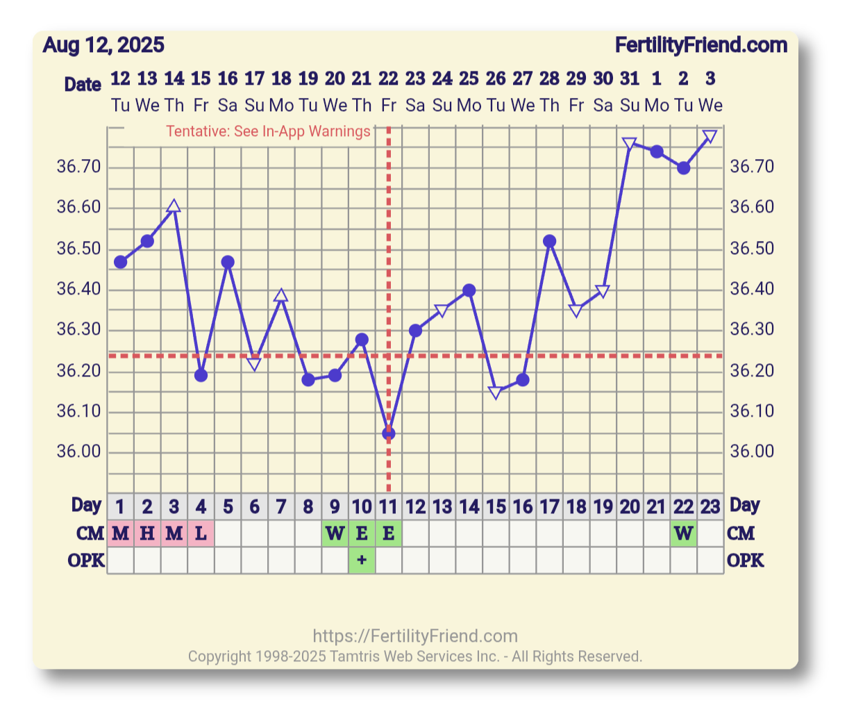 @Opahc se punainen risti meinaa, että FF on ”varmuudella” tunnistanut ovulaation. Punainen katkoviiva taas meinaa, että on ollut jotain poikkeavaa (esim lämpötilamittauksia puuttuu käyrältä, lämmöt ei oo lähtenyt tarpeeksi nousuun, lämmöt mitattu tosi eri aikaan jne..), eikä ovulaation paikka ole ihan varma. Jos taas teet jonkun ”overriden” eli muutat manuaalisesti oviksen paikkaa, muuttuu tuo risti siniseksi.