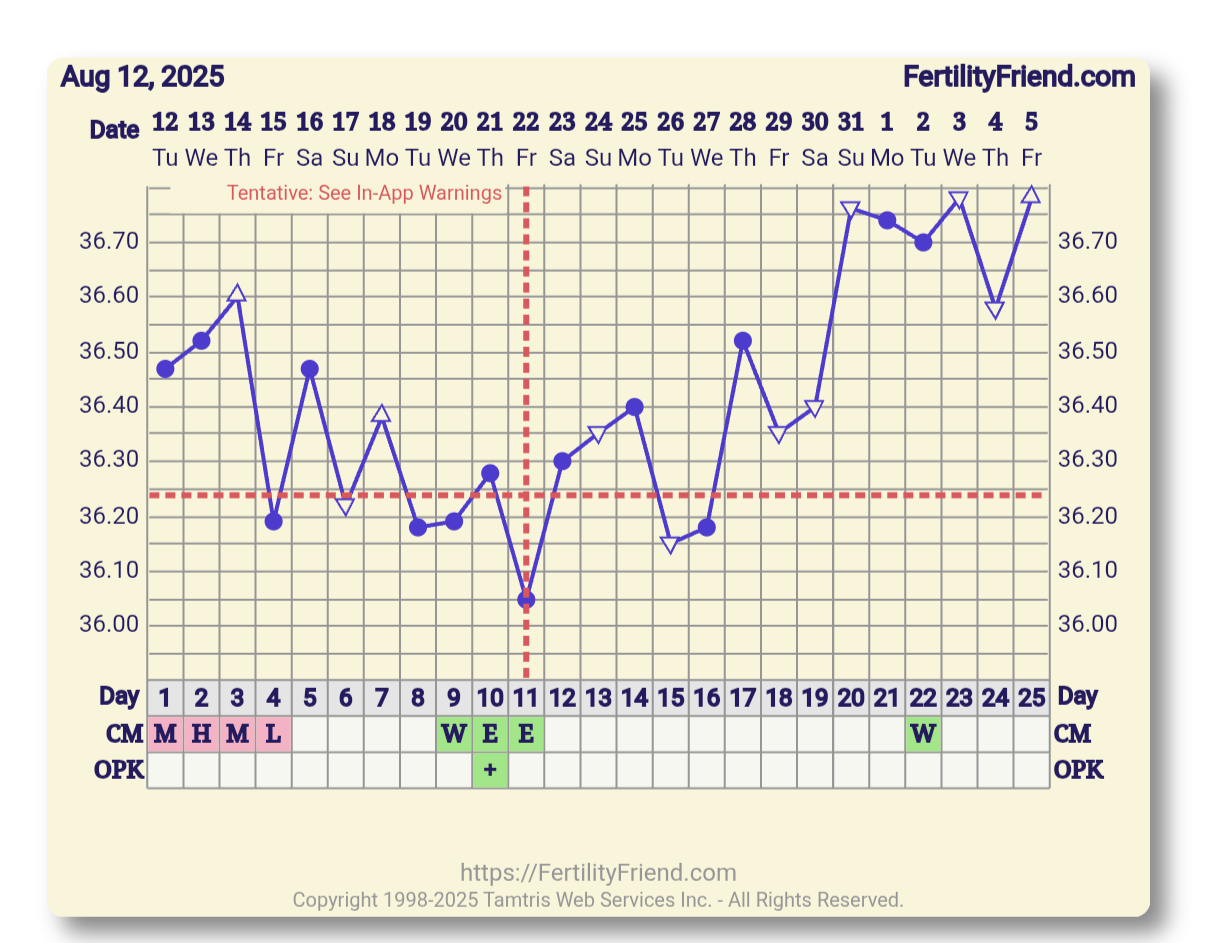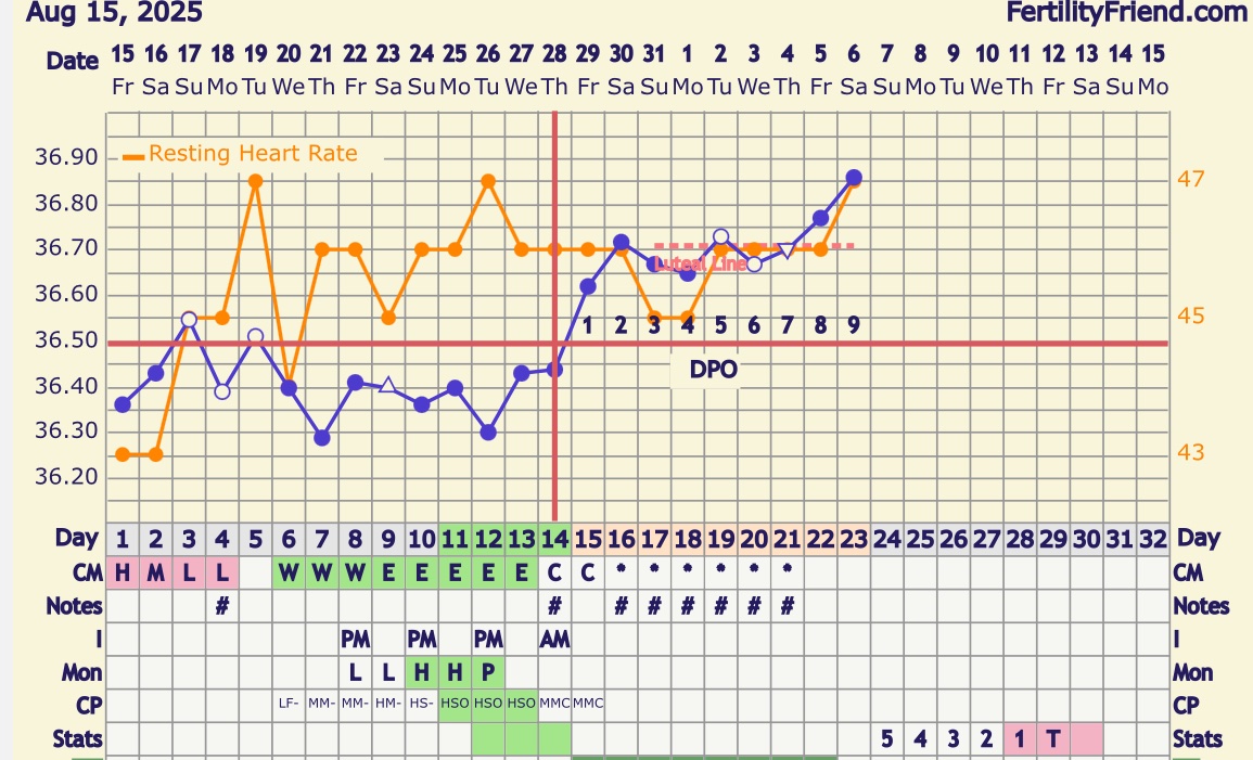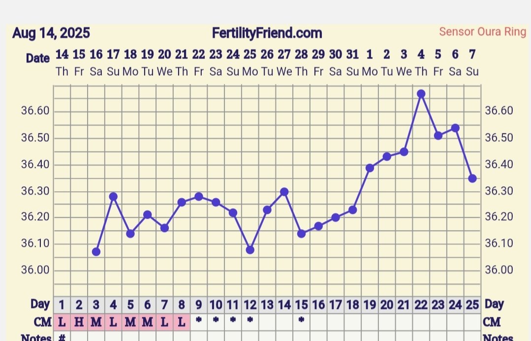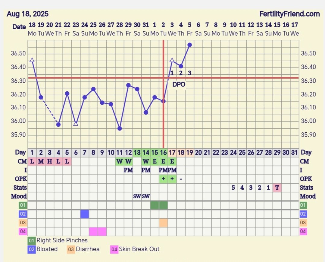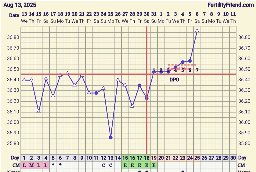 Mittaushistorian aikana ensimmäistä kertaa ei ole laskenut missään vaiheessa kiertoa lämmöt alkukierron tasolle hetkellisesti. Että on kai ainakin ollut vahvat hormonitasot tai jotain.