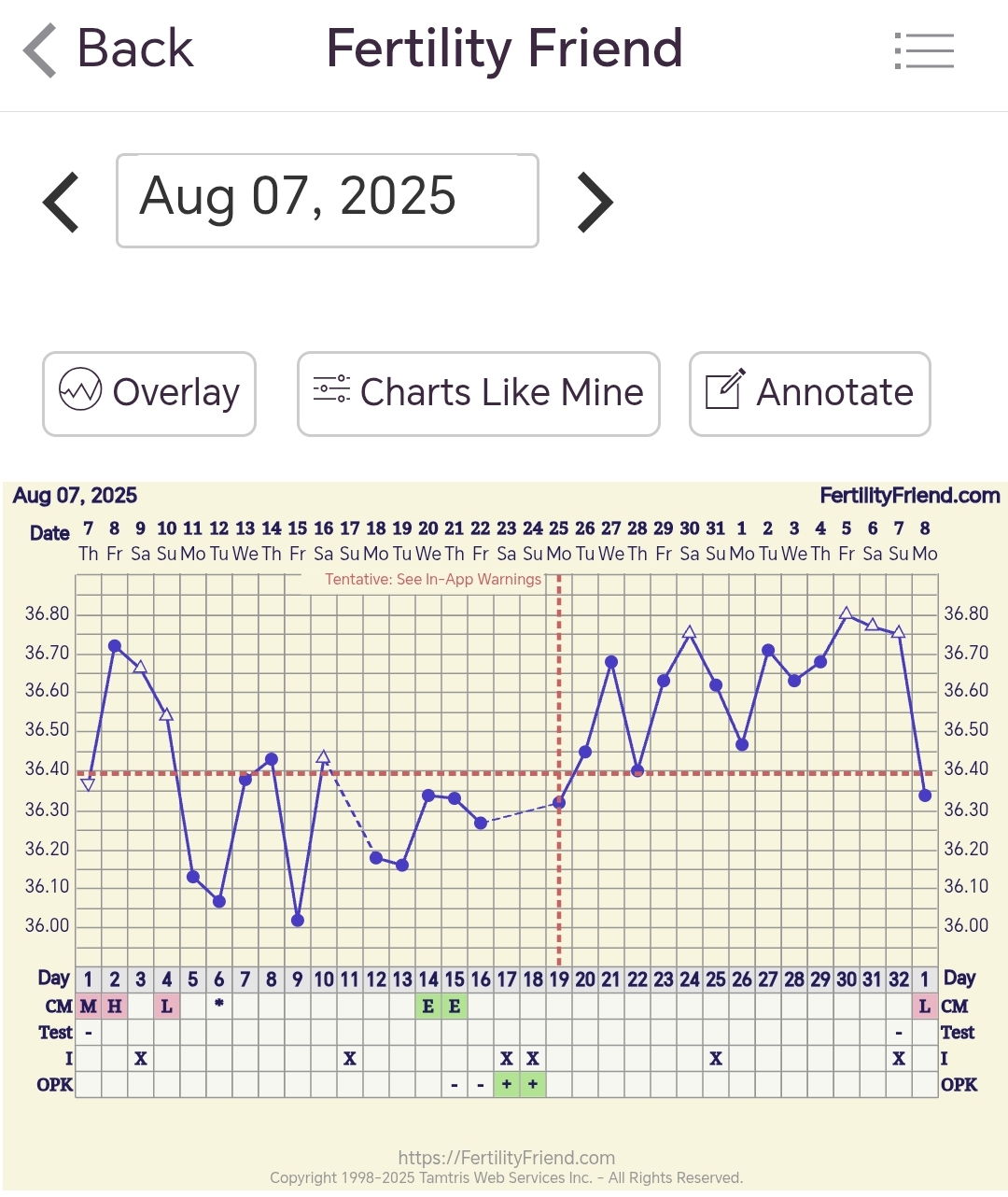 Ja jos joku kaipasi lisää anovulatoristen kiertojen charteja, niin tässä siis yksi. Mulla todennäköisesti se kystaksi muuttunut follikkeli kyllä tuotti progea jonkin verran, jonka takia lämmötkin nousi ja pysyu korkeammalla, eli "melkein normaalilta" tämäkin voi näyttää. Ovista ei ff merkannut varmaan siksi, että merkkasin joka päivälle negatiivisen ovistestin (joita ne kyllä olivatkin).