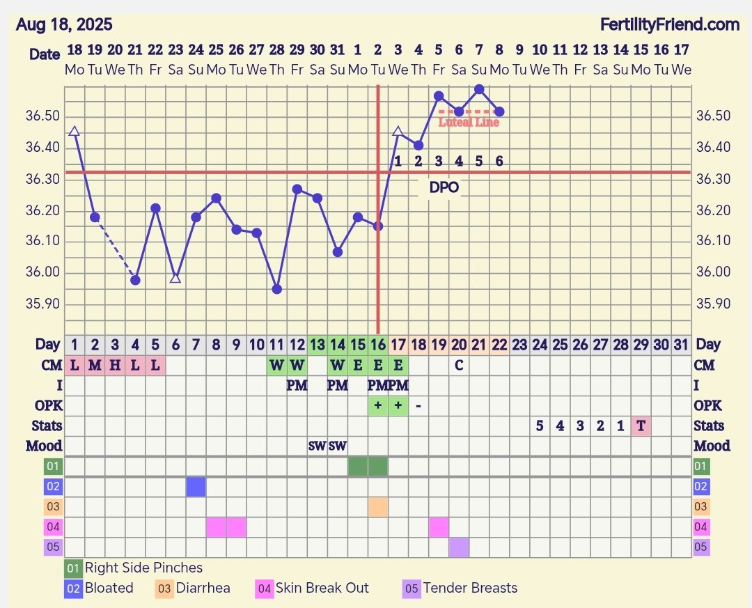 Omituista seilailua lämmöissä, jos on tapahtunut se toinen ovulaatioyritys niin varmaan tuossa viimeisimmän laskun kohdalla, itse toivon ettei olisi ja kääntyisi kohta lämmöt laskuun ja päästäisiin uutta (toivottavasti normaalia 🤞🏻) kiertoa kohti.
