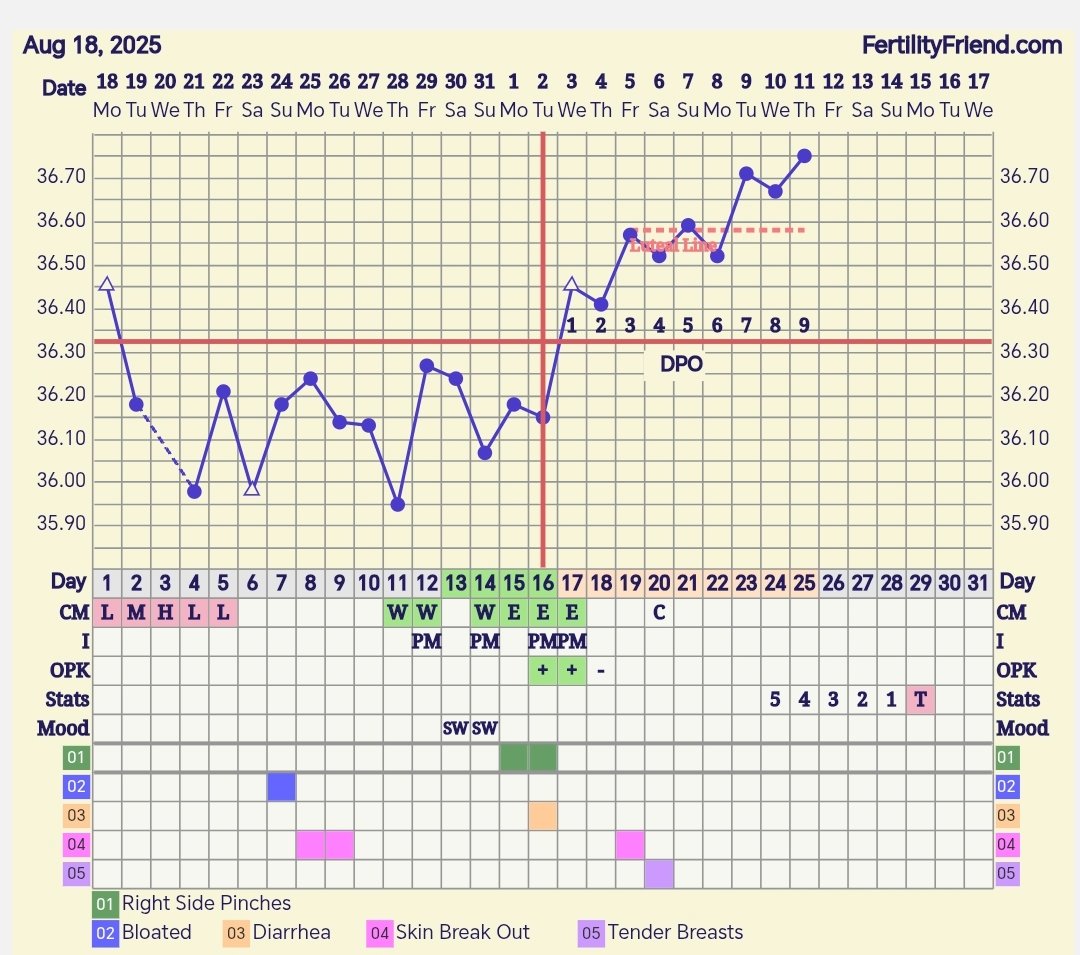 Täällä tosiaan dpo 9 ja lämmöt otti pientä nousua ylöspäin. Hieman toiveikas olo. Toissayönä näin unta et tein niin räikeän plussan, niin uitimpa sit jo eilen päivällä hetken mielijohteesta testin. Loppupäivä sit menikin sitä testiä tuijotellessa 😂 Ei siinä kyllä testiajalla mitään näkynyt, kuivuneena toinen hailakka viiva näkyy. En kuitenkaan luota siihen niin että innostuisin.
