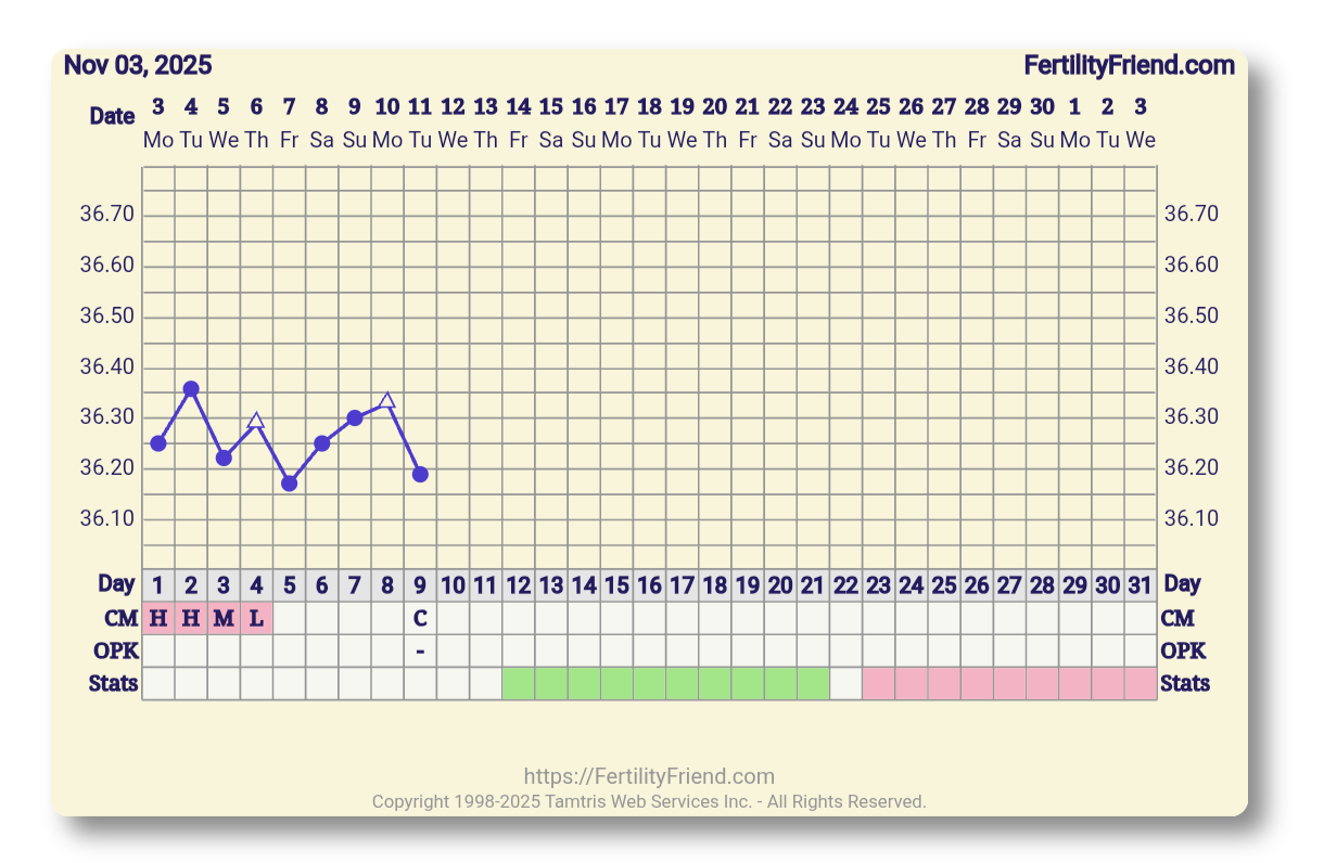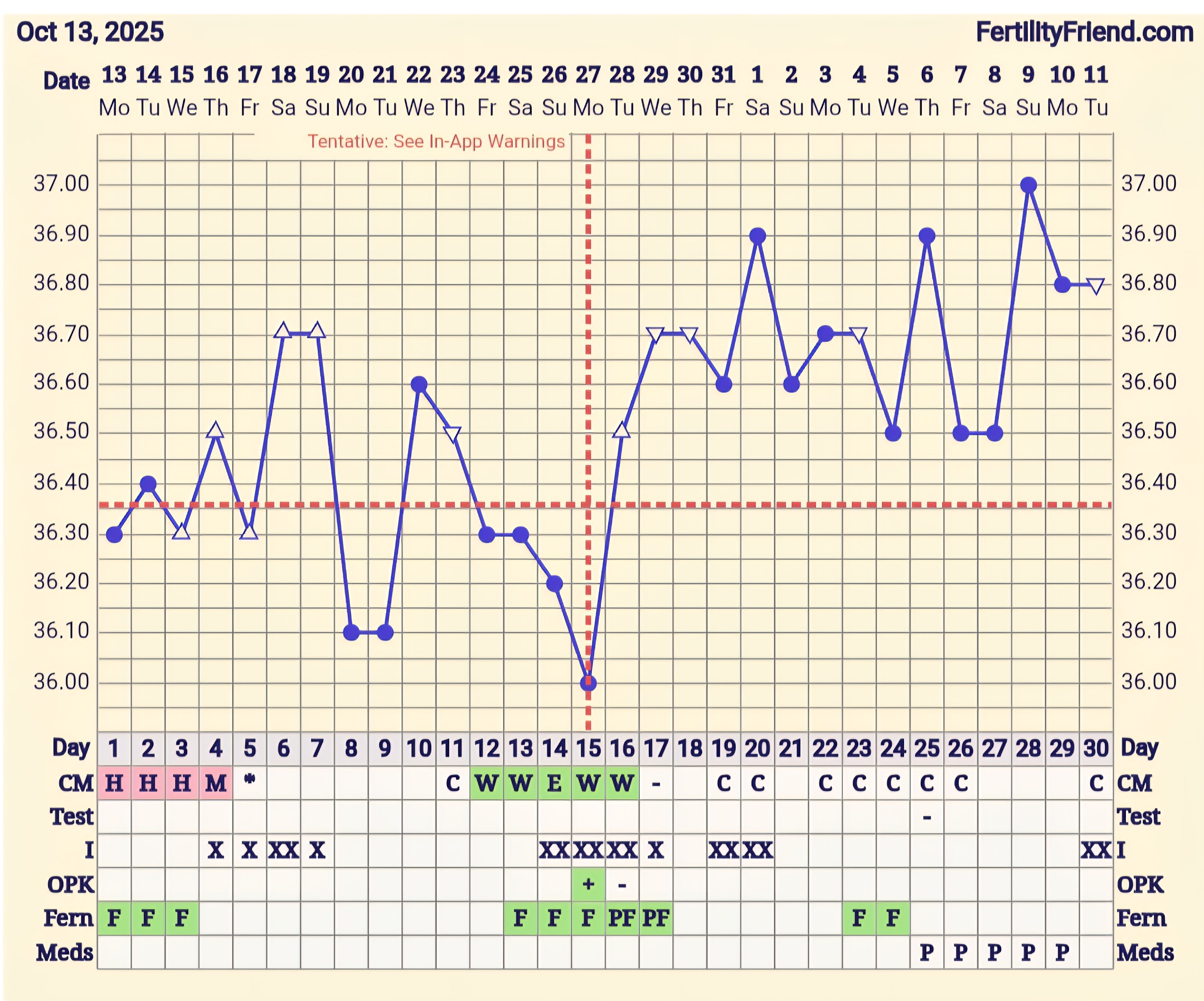 Kyllä täällä taidetaan luteaalin puolella jo olla, ristiviiva pysyy vaikka viikonlopun korkeat lämmöt jättäisikin huomiotta. Sitten vaan taas odotellaan... 🌈
