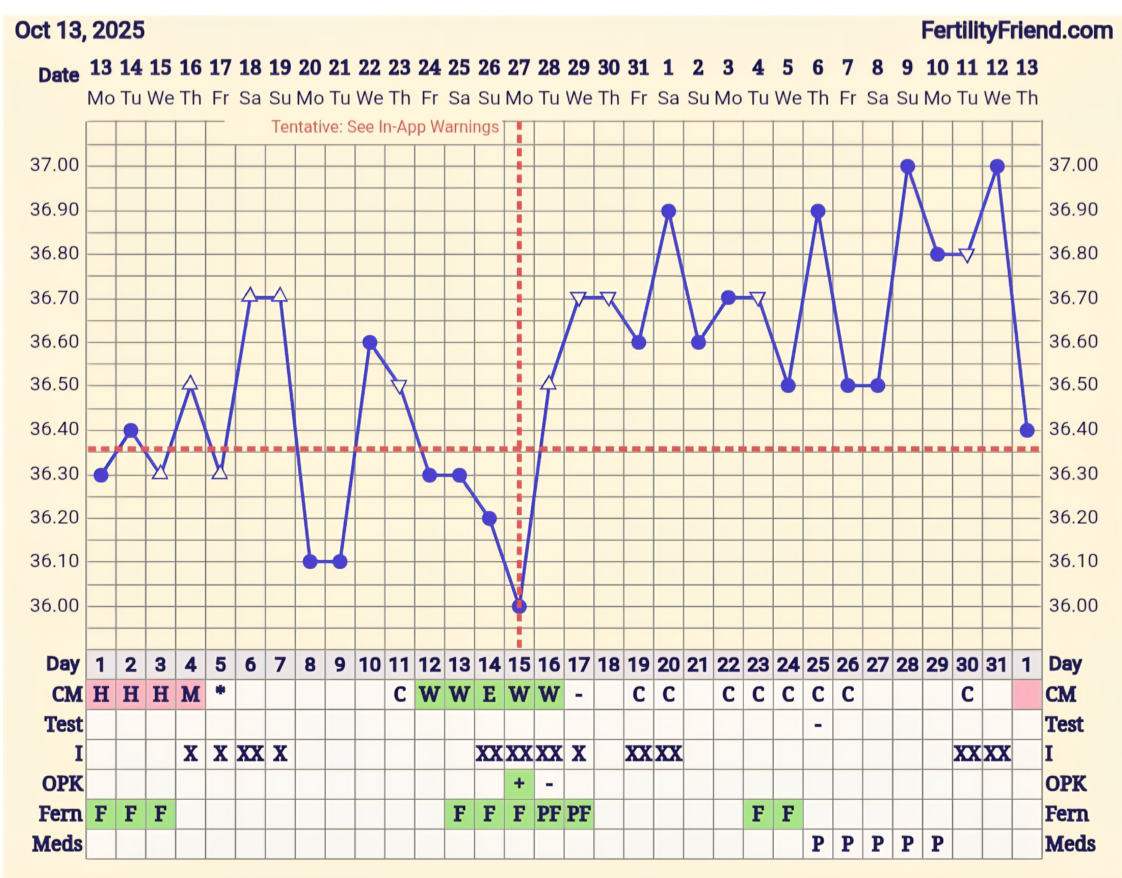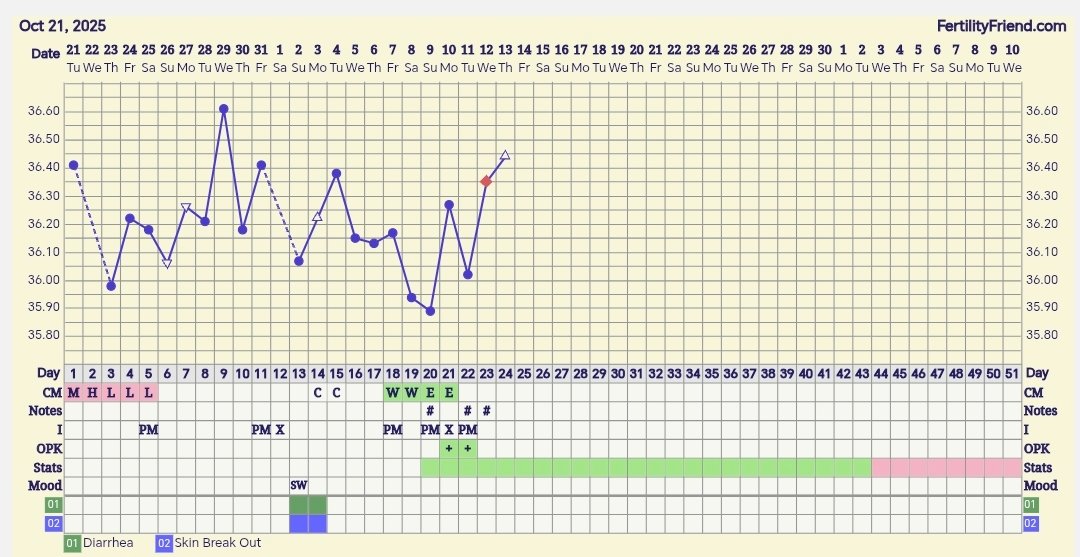 sun käyrässä ihan selkee menkkadroppi! Just tolleen ne mullakin useimmiten tippuu kun vuoto alkaa ja sit seuraavat päivät yleensä jatkaa tippumista. Ihan alkukierto voi olla vähän korkeammalla ja sit oviksen lähestyessä yleensä lämmöt kaikkien matalimmat. Sehän voi olla, että prolaktiinin ja TSH:n yhteisvaikutus jotenkin vaikeuttaa asiaa. Toki teillä vielä suhteellisen lyhyt yritys, joten voisin uskoa että mahdollisuus onnistua luomuna on hyvä